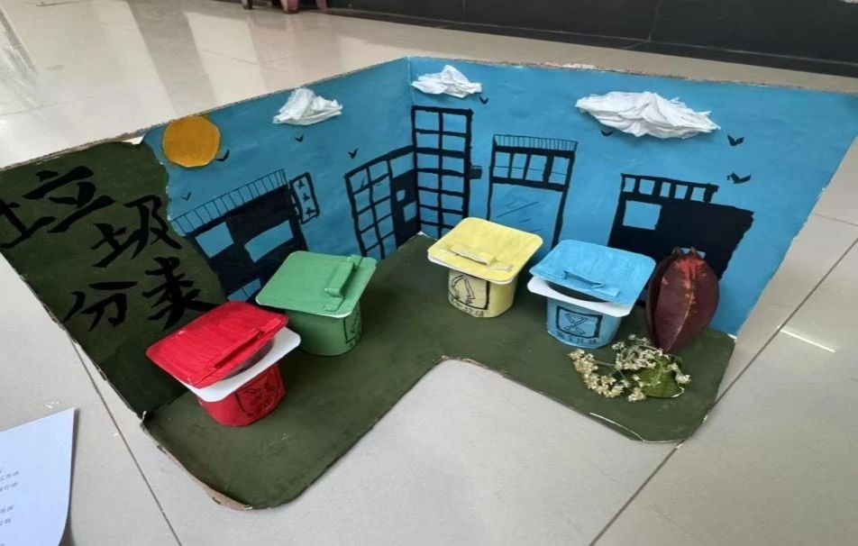 作品通过手工模型向大家展示了垃圾分类的重要性。模型中四个彩色垃圾桶由二次回收的酸奶盒制作,分别代表可回收物、厨余垃圾、有害垃圾和其他垃圾,清晰标识便于正确投放。作品模拟了垃圾分类后的场景,强调了其对环境保护和资源循环利用的积极影响。通过直观的展示,作品旨在提高公众的环保意识,鼓励大家积极参与垃圾分类,共同为建设绿色城市贡献力量。