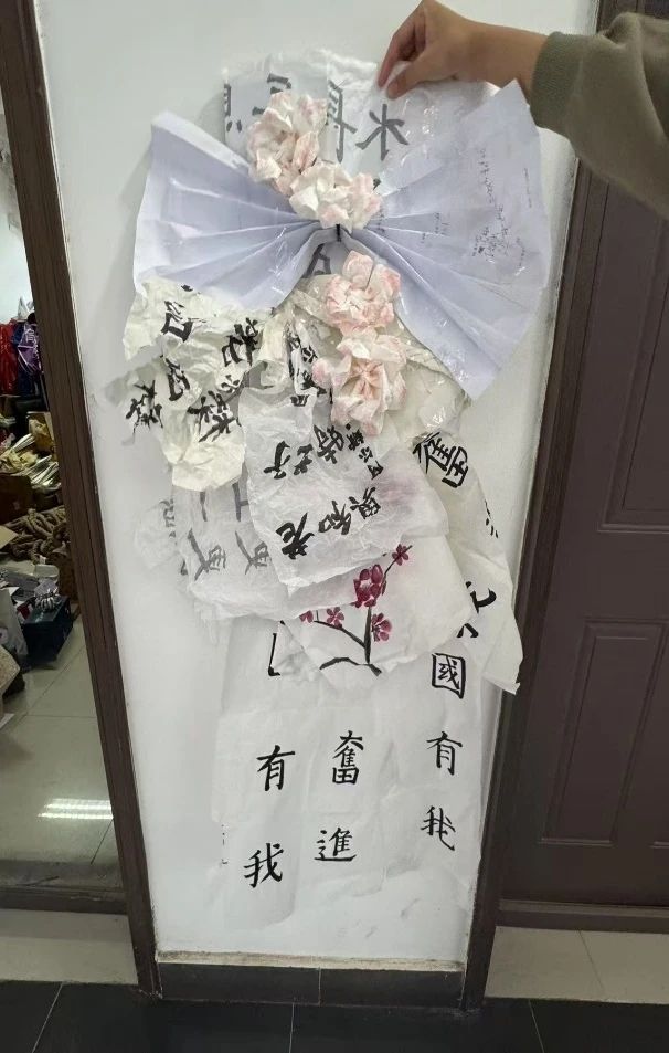 创作灵感源于对传统与创新融合的思考。将书法课所用的纸以及日常学习生活中产生的废纸解构重组为服装,是打破常规的大胆尝试。用材仅为废旧纸张与少量辅助固定材料。通过巧妙折叠、缠绕、拼接,把平面报纸塑造出立体服装形态。蓬松大蝴蝶结与不规则裙摆,既展现随性自由,又具复古韵味。这一作品意在打破时尚与日常的边界,以环保视角,让旧纸重焕生机,用时尚语言讲述对资源再利用的倡导,也为大众带来视觉与理念的双重冲击。