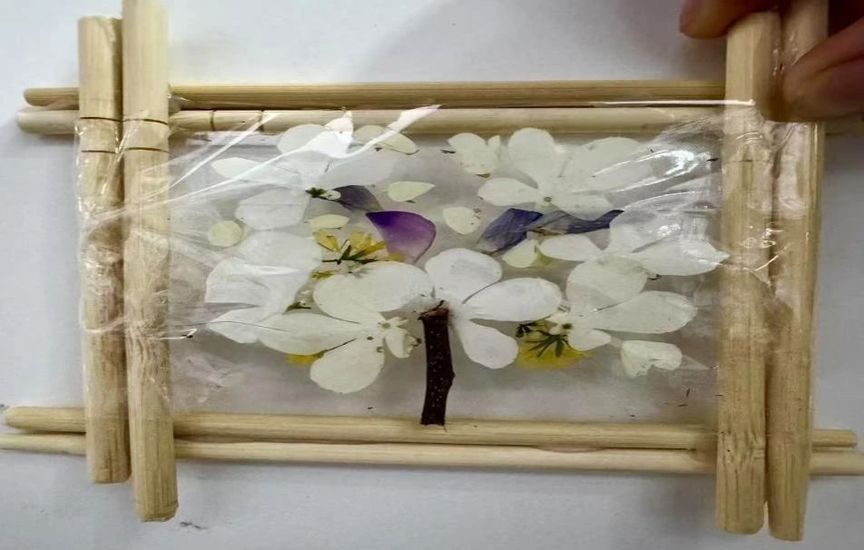 该作品是一件利用自然材料创作的艺术作品,旨在捕捉和保存春天的美丽瞬间。框架内,透明塑料膜上精心排列着各种鲜花花瓣,包括白色、紫色和黄色的花瓣,它们以自然的方式组合,展现出春天的多彩与和谐。这件作品不仅是对春天的赞美,也是对自然之美的颂歌。它鼓励人们在忙碌的生活中停下脚步,去发现和欣赏周围自然界的美丽,从而激发对环境保护的意识和行动。通过这样的艺术创作,我们希望能够唤起人们对自然的敬畏和爱护,共同守护我们美丽的地球家园。
