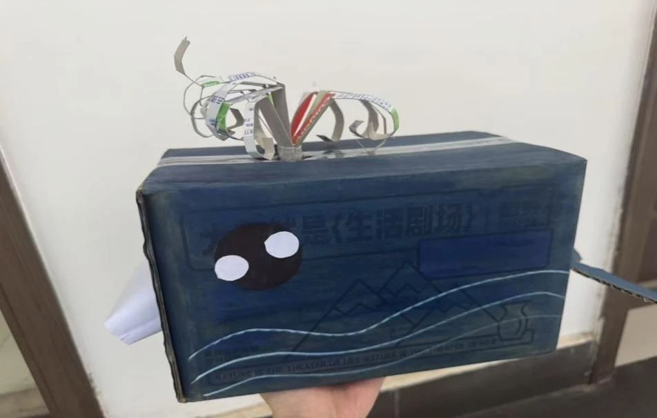 我们利用废弃的快递纸箱制作了一条生动的鲸鱼模型。首先,我们将纸箱拆开并重新组装,然后在纸箱上涂上深蓝色,并模仿鲸鱼皮肤的波浪纹路。通过巧妙的拼接技术,我们使鲸鱼的尾巴能够摆动,从而营造出小鲸鱼在深海中游动的视觉效果。与传统的环保手工不同,这条立体鲸鱼不仅是一件艺术品,还可以作为收纳盒使用,既可以放在宿舍或教室作为装饰品,也可以收纳小物件,实现资源的循环利用。我们希望通过这个设计传达一个信息:每个被丢弃的快递盒都有可能变成守护海洋的小生命,鼓励大家重视环保,赋予废弃物新的生命。