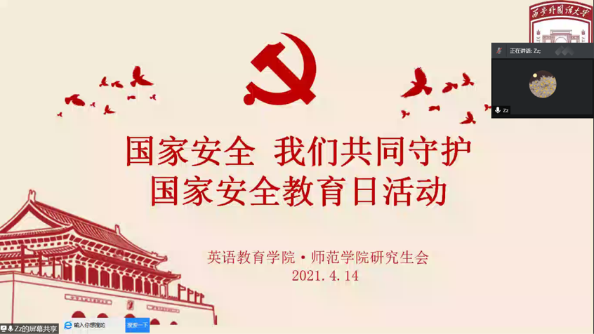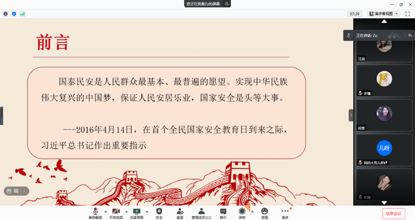 ·师范学院研究生会开展了国家安全教育日线上主题教育活动。本次活动由院研究生会主席王真主持,研究生辅导员薛璐及全体院研究生会成员参加。