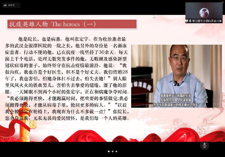 会议第二项,学习部的牛小颖同学用双语分享了伟大抗疫精神的精神内涵,并向同学们介绍了抗疫英雄人物张定宇与张文宏。抗疫精神是万众一心、同舟共济的守望相助精神;是闻令而动、雷厉风行的英勇战斗精神;是顾全大局、壮士断腕的“一盘棋”精神;是舍生忘死、逆行而上的英雄主义精神;是充满信心、敢于胜利的积极乐观精神。在了解抗疫英雄的伟大事迹后,我们深切感受到作为青年学生,一定要不负韶华,用自己的不懈努力为祖国的未来贡献力量。