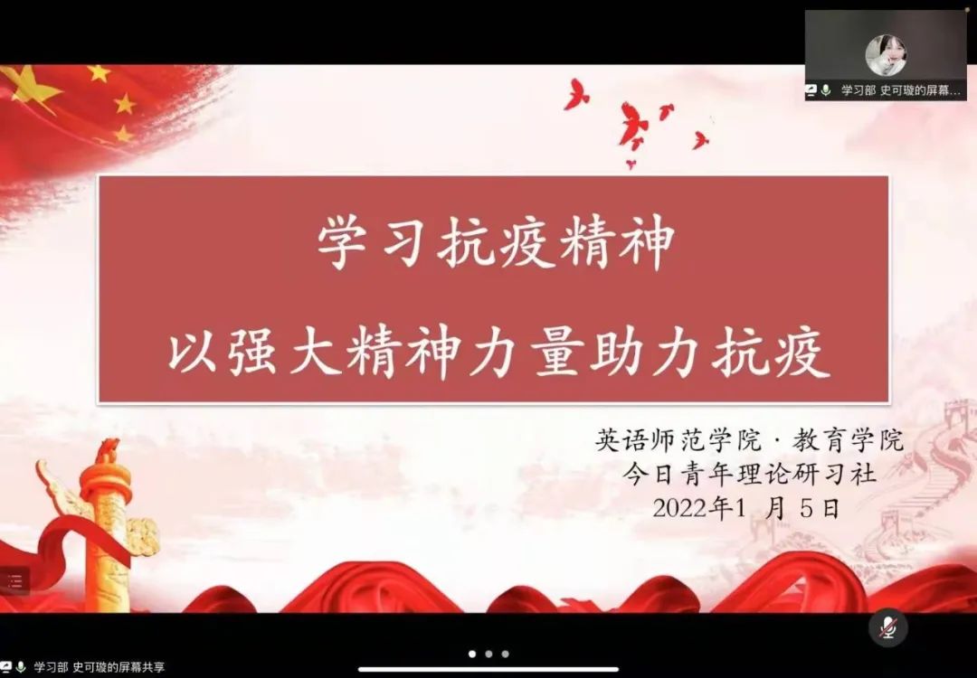 “今日青年”思政理论研习社以腾讯会议线上方式举行了以“学习抗疫精神,以强大精神力量助力抗疫”为主题的中英双语学习活动,社团全体成员参与,本次活动由社团学习部负责人史可璇主持。