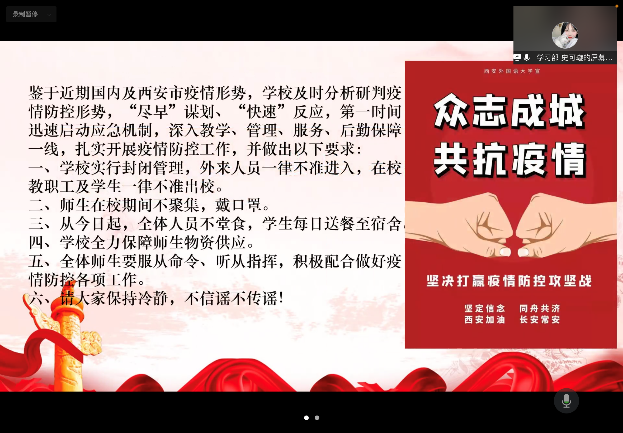 针对当前西安市的疫情形势,史可璇同学带领大家了解了我校面对疫情所采取的防疫措施:面对突如其来的疫情,我校及时分析研判疫情防控形势,“尽早”谋划、“快速”反应,第一时间迅速启动应急机制,深入教学、管理、服务、后勤保障一线,扎实开展疫情防控工作。作为西外的一份子,我们也要做好个人防护工作,积极配合学院、学校的各项工作安排。在特殊时期,共克时艰,西外始终与我们同在。