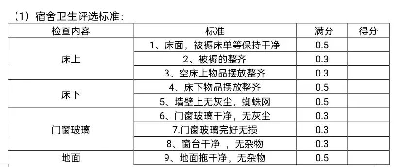 3.评比流程:通过三月查寝评分,根据打分情况评选出10间模范宿舍。2间预科生宿舍,6间本科生宿舍,2间研究生宿舍)