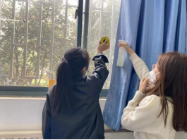教师分工有序,协同合作,对办公区域进行全覆盖、无死角的卫生大扫除,并按消毒规范做好环境消杀。