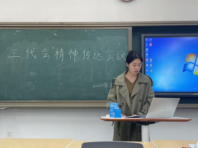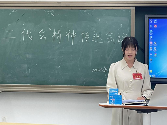 代表牛小颖、杜亦菲和李俊霞三位同学分别带领与会成员对共青团陕西省第十四次代表大会精神、西安外国语大学第三次团代会及第五次学生代表大会精神进行了细致深入的学习。牛小颖在领学中带领同学们重温了习近平总书记对青年的寄语,号召英师学子争做有理想、敢担当、能吃苦、肯奋斗的新时代三秦好青年,深⼊学习贯彻习近平总书记关于⻘年⼯作的重要思想和来陕考察重要讲话重要指示,全⾯贯彻落实党的⼆⼗⼤精神,认真落实省第⼗四次党代会和省委⼗四届三次全会部署,让⻘春在奋进中国式现代化新征程、谱写陕⻄⾼质量发展新篇章中绽放绚丽之花;杜亦菲从我校第三次团代会的主题、报告等内容展开宣讲,带领同学们回顾了过去几年我校共青团的工作,传达了当前我们面临的新形势新任务及未来共青团工作的计划,也表达了本人对团学工作的信心和热情;李俊霞传达我校第五次学代会精神时重点从学生会的工作回顾与总结出发,号召广大学生会成员以政治引领为根,以自我革新为要,以服务同学为根本,不断夯实信仰之基,强化组织建设,致力于为同学办更多好事实事。