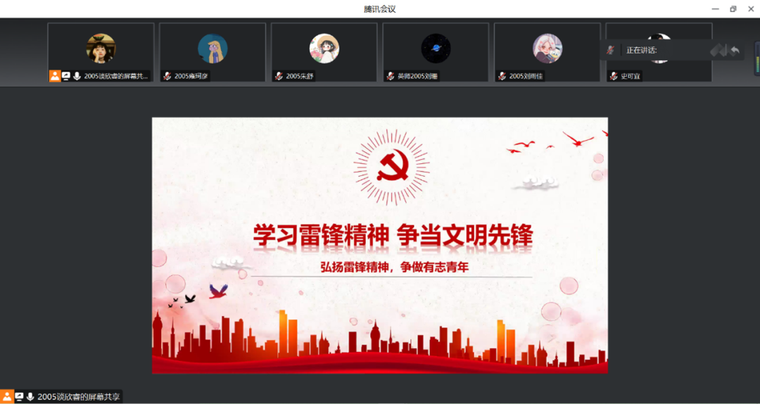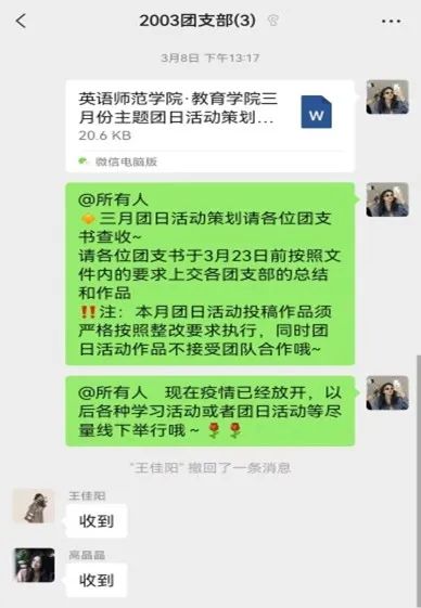 通过线下、线上相结合的方式,团支书组织英师2005班同学展开此次团日活动。首先,团支书组织开展了以“三代会精神”为主题的分享宣讲会,带领同学们深入学习贯彻三代会精神,引导同学们树立远大理想,并更加清晰的意识到当代青年身上所肩负的责任感与使命感,激励同学们在日后的学习生活中勤奋学习,勇于担当,逐步实现个人价值。其次,团支书组织同学们一起重温雷锋事迹,体会雷锋精神。并在实例事迹中,带领同学们了解并学习了雷锋精神的当代内涵及具体内容。