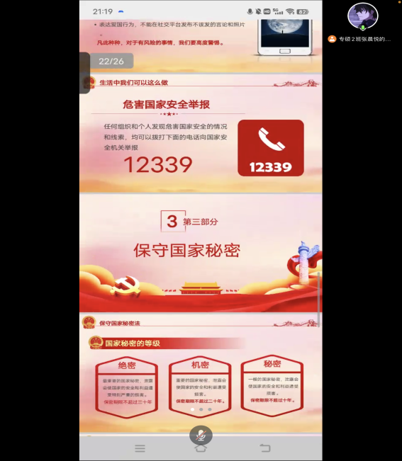 团支书带领大家一起学习了关于国家秘密的内容,包括国家秘密的等级、国家秘密的基本范围、涉密载体等同学们之前不太了解的知识,同学们认真倾听,积极参与到探讨活动中。