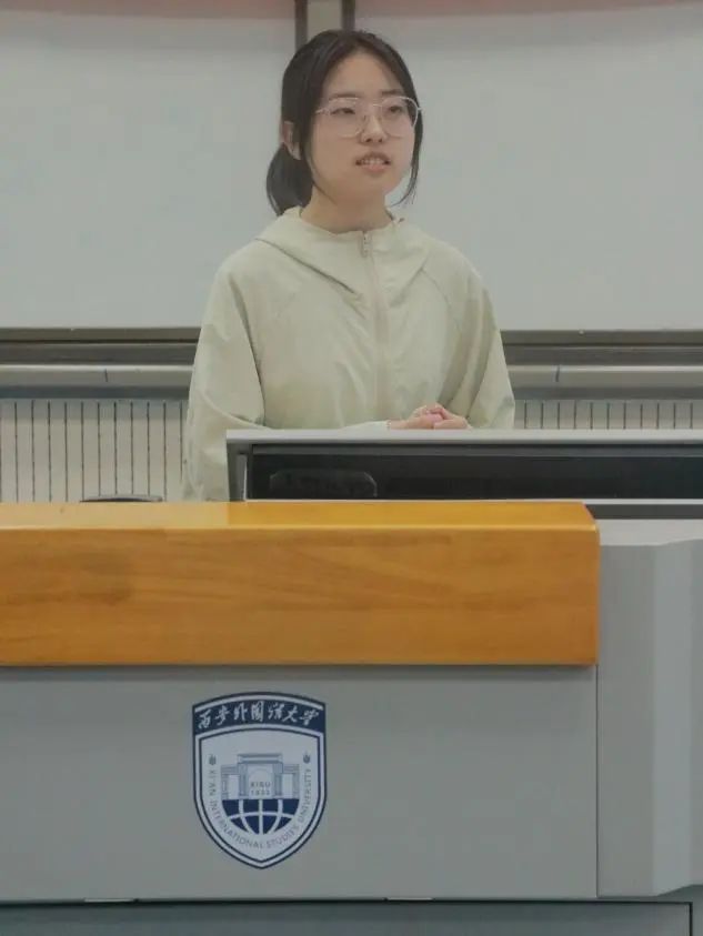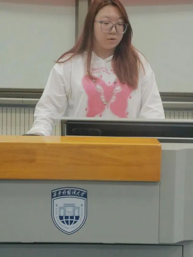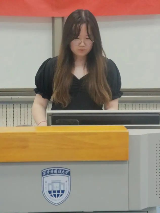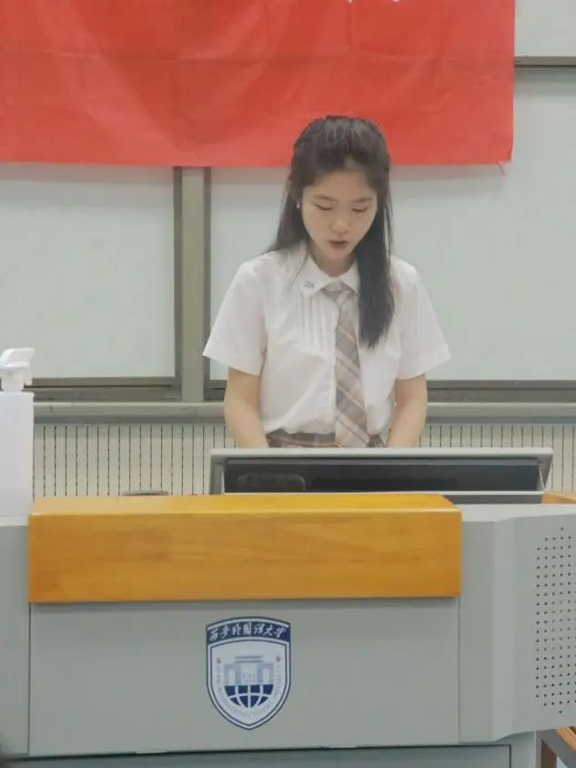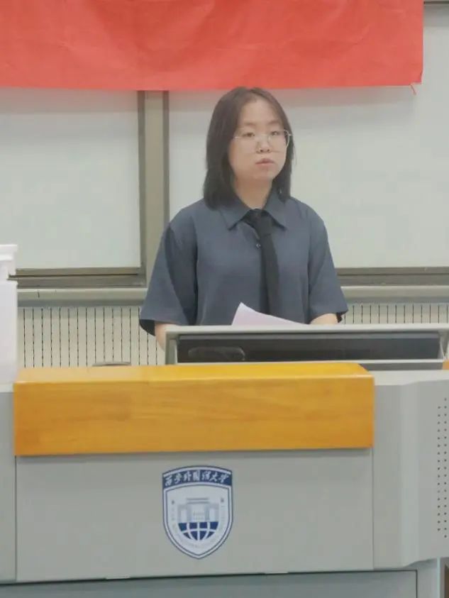随后,团学干部代表白诗勤发言,她总结了自己在团学的学习和工作经历,感谢团委学生会为她提供了施展才能的平台,还激励全体学生干部肩负起责任感,做好本职工作,以身作则为学院和同学服务。