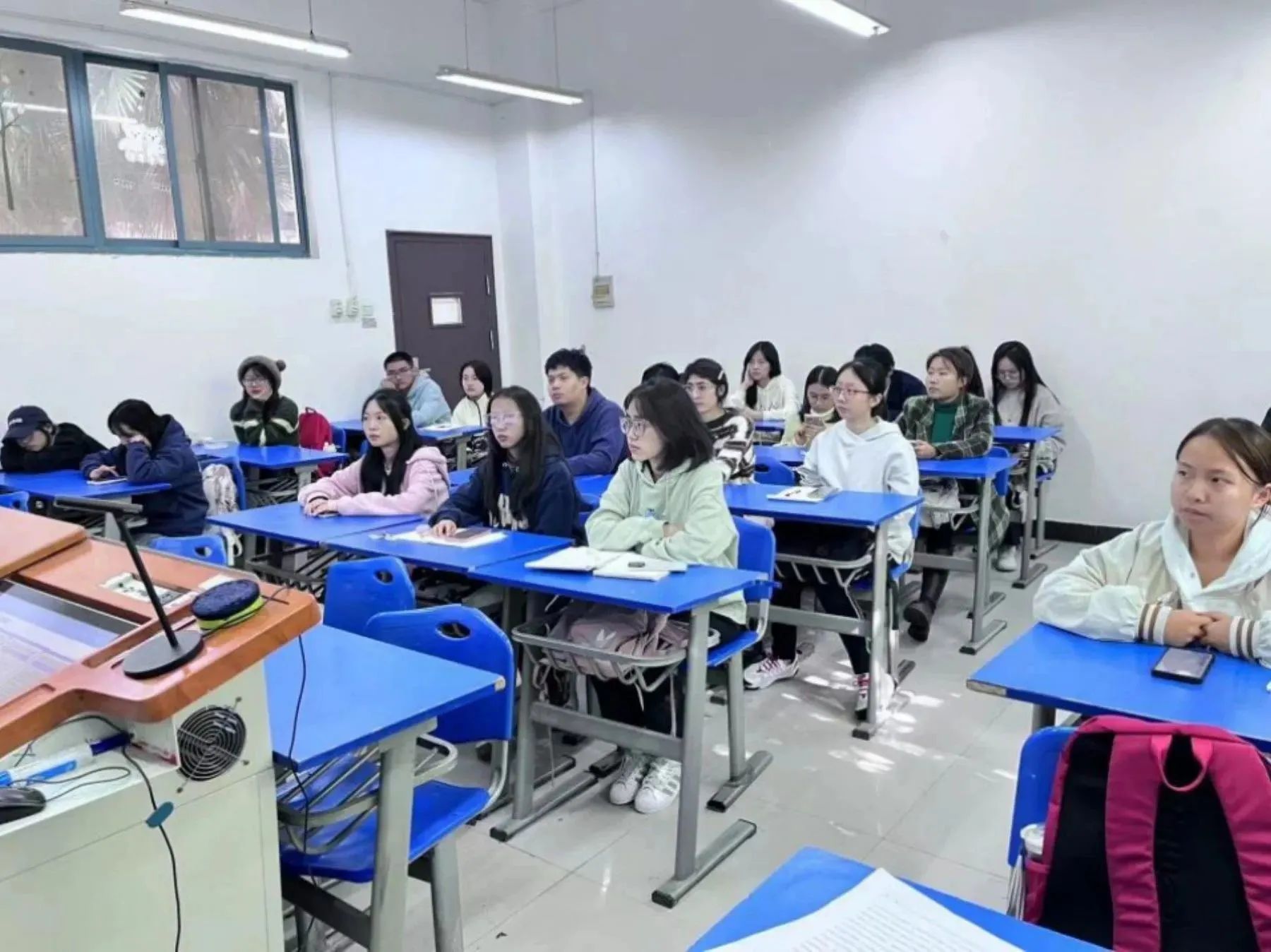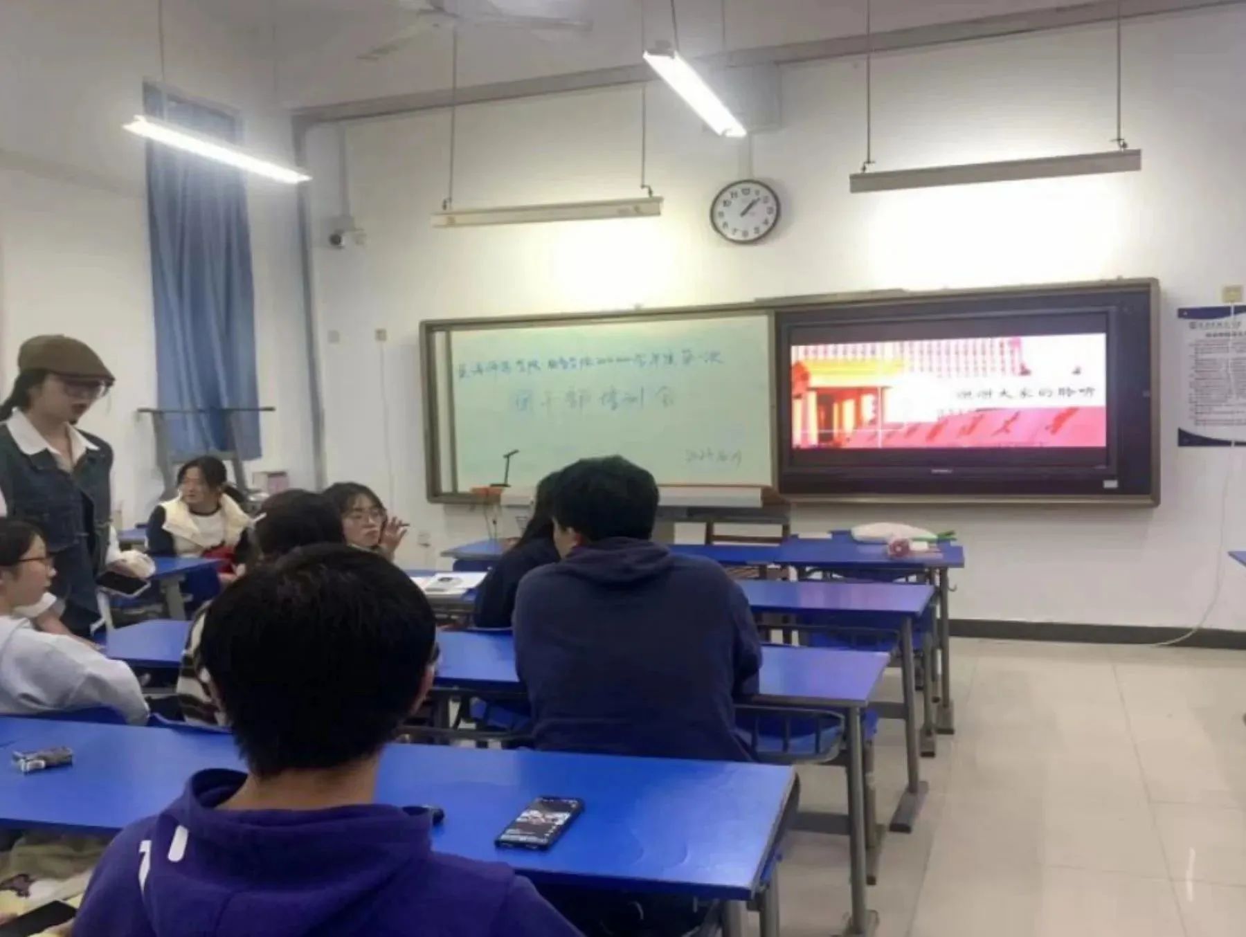 团委学生会组织部负责人薛恒和嘉宾2208班团支部书记牛媛钰同学,参会人员包括本科2022级各班团支书、2023级预科班团支书和2023级各班团支书、综合委员。