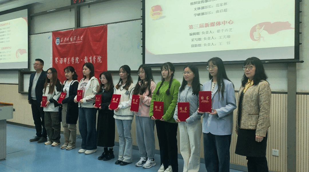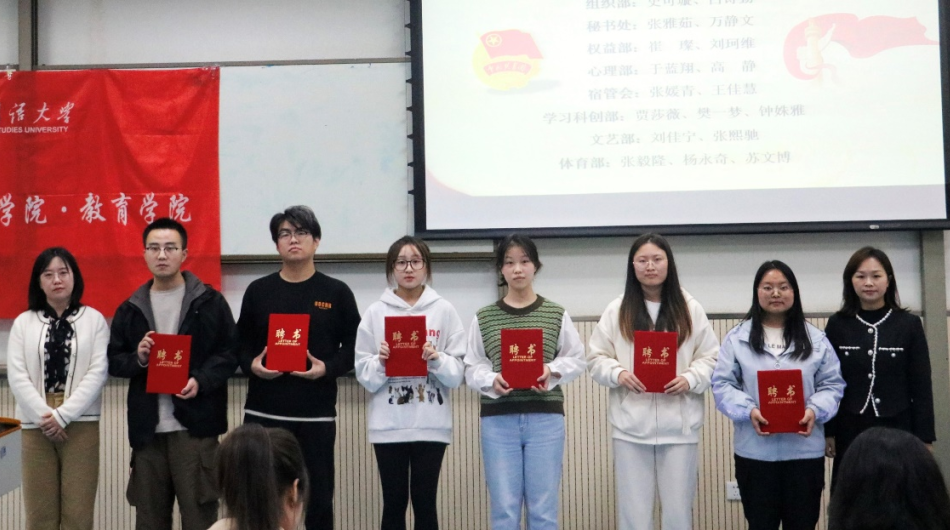紧接着,学院领导老师依次为学生干部代表颁发聘书。学生组织中上一届学生干部的光荣退出,新一届学生干部的斗志昂扬,无一不昭示着英师学生组织的生机活力。