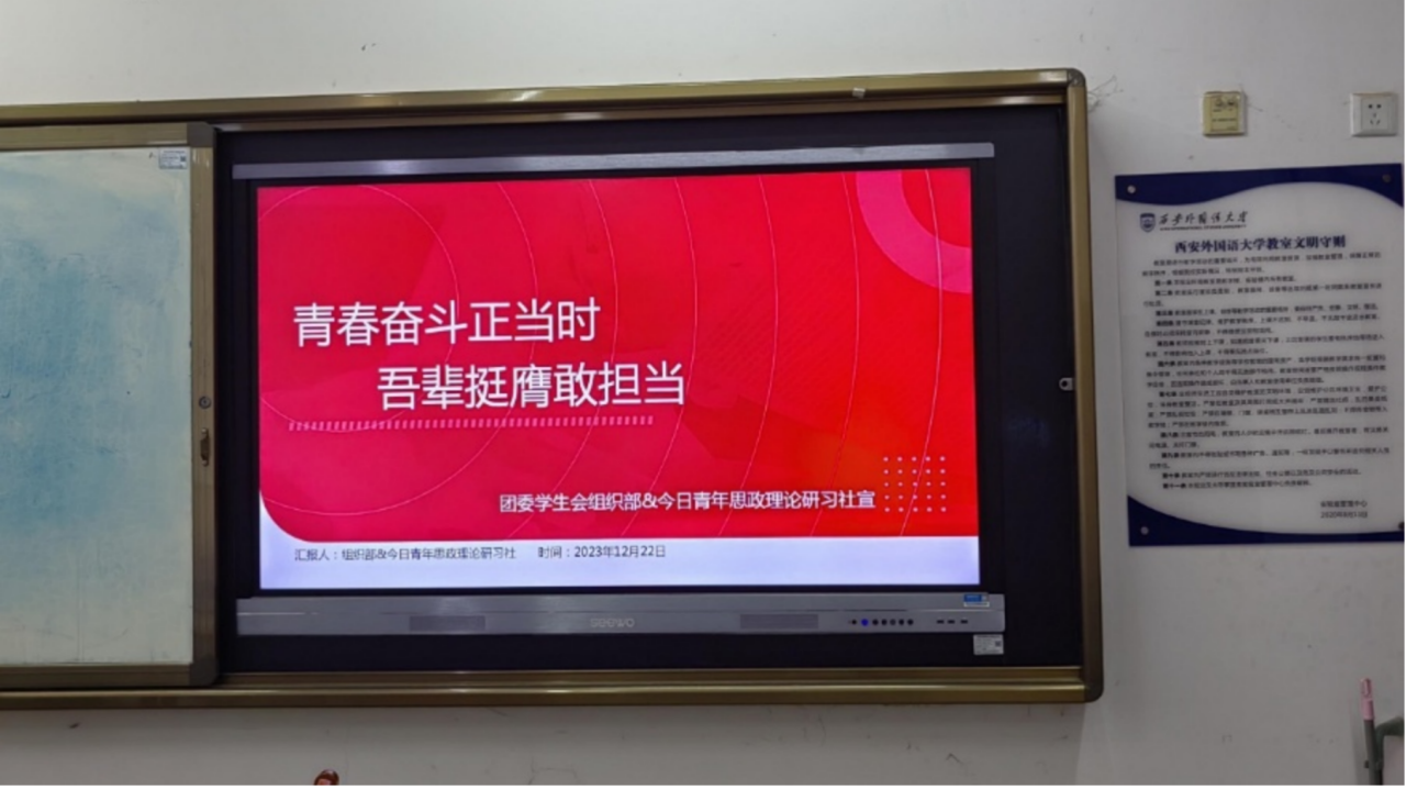 为了进一步加强对青年群体的思想教育,2023年12月22日,团委学生会组织部与“今日青年”思政理论研习社联合举办了一场主题为“青春奋斗正当时,吾辈挺膺敢担当”的学习活动,全体成员按时参加会议,指导老师刘芳线上参加会议。此次活动旨在激发青年学子的奋斗精神,培养青年学子的担当意识。