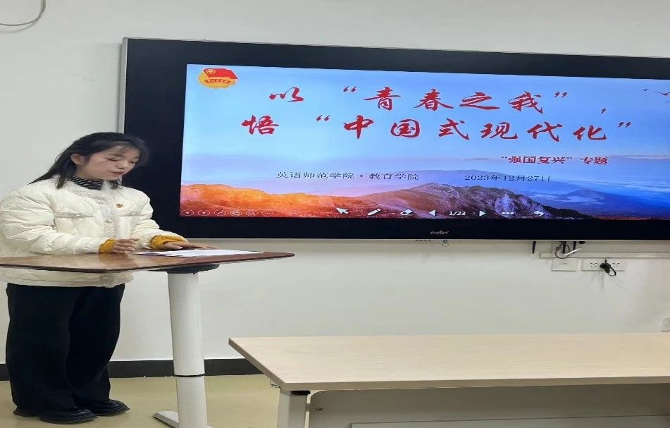 会议最后,为学习宣传贯彻党的二十大精神,深入贯彻落实学习习近平总书记关于青年工作的重要思想,青年宣讲团成员刘瑜展示“以‘青春之我’,悟‘中国式现代化’”主题示范团课。刘瑜同学以杭州亚运为切入口,指出中国式现代化是实现中华民族伟大复兴的根本方向和实践要求,是不断取得新时代中国特色社会主义新胜利的根本遵循和重要指引。加深新发展团员们对中国式现代化的理解,并鼓励新发展团员们脚踏实地,敢想敢做,让青春在全面建设社会主义现代化国家的实践中绽放光彩。