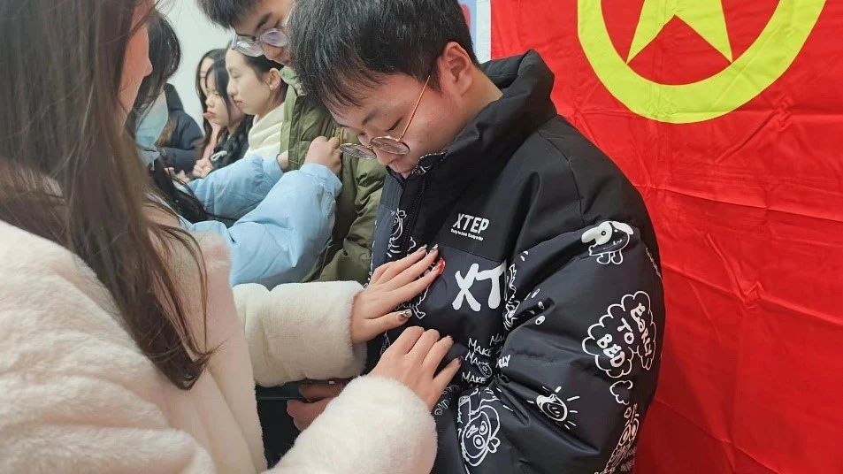 会议第二项,参会团支书为新发展团员颁发团员证并亲手佩戴团徽。手中崭新的团员证,胸前闪亮的团徽,在此刻亦同他们心中的远大理想与志气一般,显得格外耀眼。在主持人的领誓下,全体新发展团员举起右拳,以饱满的热情与激昂的青春活力带领全体新团员进行宣誓。在未来,相信他们可以恪守承诺、不忘初心、牢记誓词,担当起自己肩上的重任,闪耀优秀共青团员的模范光辉。