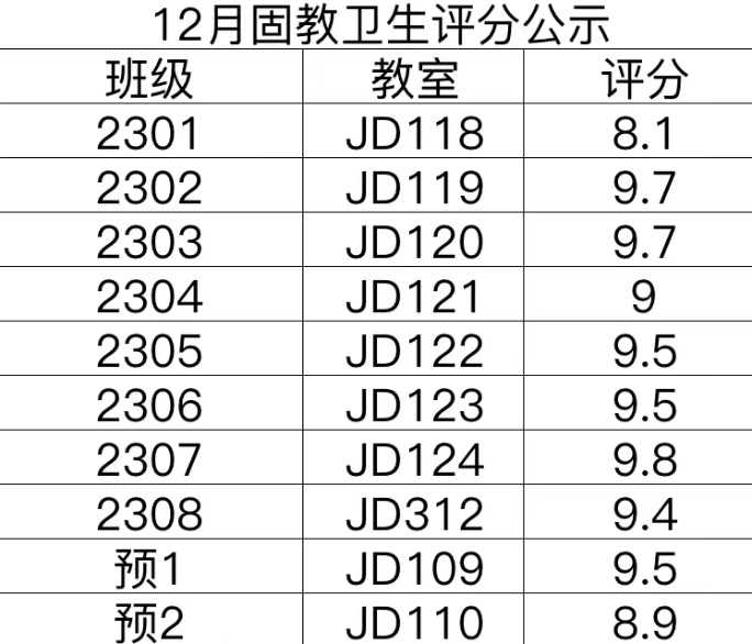 多数教室环境干净整洁,桌椅摆放整齐,但个别教室存在垃圾未及时倾倒、讲台桌摆放杂乱等问题,希望同学们能继续加油,共同打造干净整洁的学习环境!