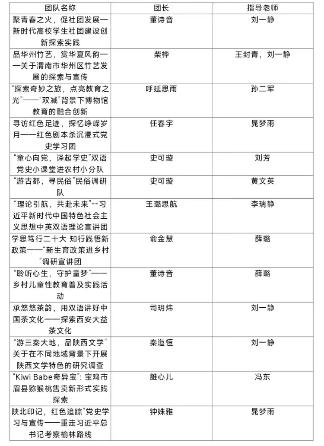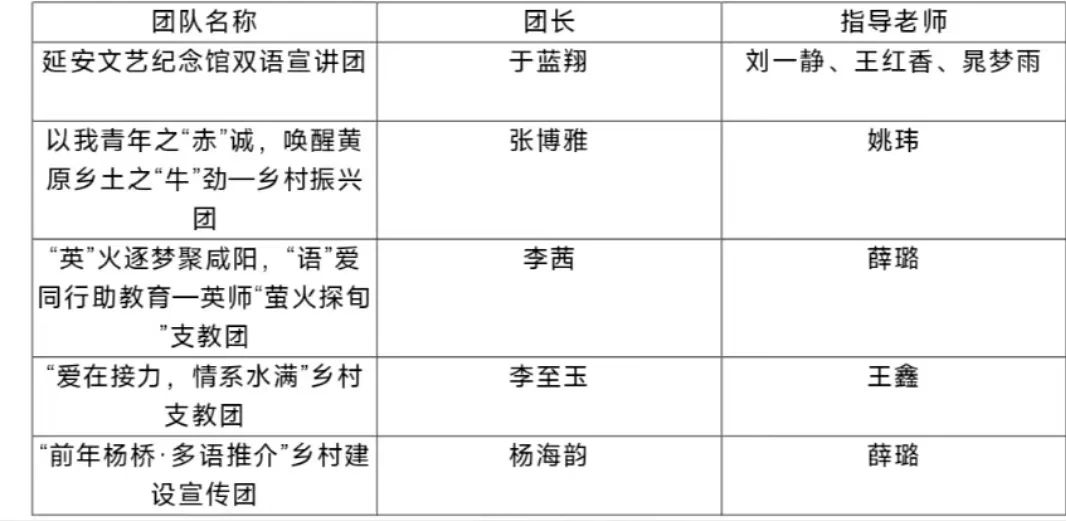 延安文艺纪念馆双语宣讲团、以我青年之“赤”诚,唤醒黄原乡土之“牛”劲—乡村振兴促进团、“英”火逐梦聚旬阳,“语”爱同行助教育—英师“萤火探旬”支教团、“爱在接力,情系水满”乡村支教团、“千年杨桥·多语推介”乡村建设宣传团等5支团队入围校级重点团队。