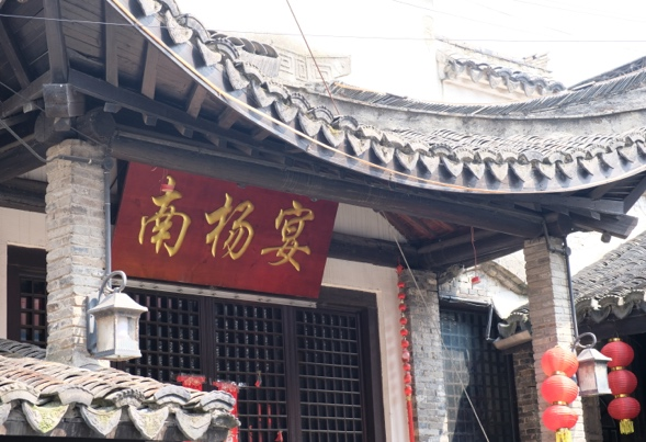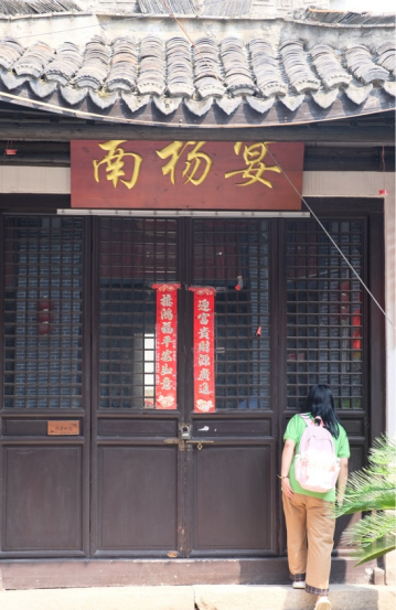 在杨桥村团书记顾杰的带领下,调研队伍来到太平庵前。庵堂始建于明代重修建于现代,外观大气而不失肃穆,颜色明黄而锃亮。经介绍,太平庵为杨桥古寺,是当地居民举行祭祀、祭拜祖先之地,也是村子里保存完善的古建筑之一。在青石街上缓步向前,便来到了街中心一座古雅的建筑前,牌匾上提“南杨宴”三大字。据顾杰介绍,队员们了解到“南杨宴”早年为杨桥内的一座戏楼,现在被重新开发,用作私人宴请的处所。