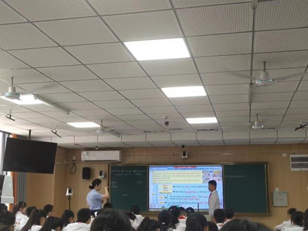 师生在会议大厅进行见习教育交流活动总结讲座,张校长向九州娱乐