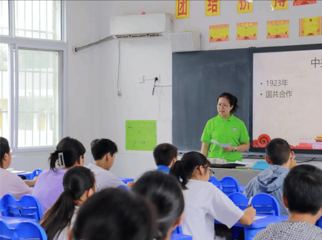 团队成员窦博乐结合八年级道德与法治课、历史课内容,在国旗下进行党史教育专题课。从播下革命火种的小小红船,到领航复兴伟业的巍巍巨轮,窦博乐通过众多史实、事例带领八年级的学生从身边小事中感受百年党史。课堂上,她通过学生演绎、身临其境等方式,与新入团的同学们分享感悟,鼓励大家通过学习明理,让青春在挺膺担当中焕发绚丽光彩。