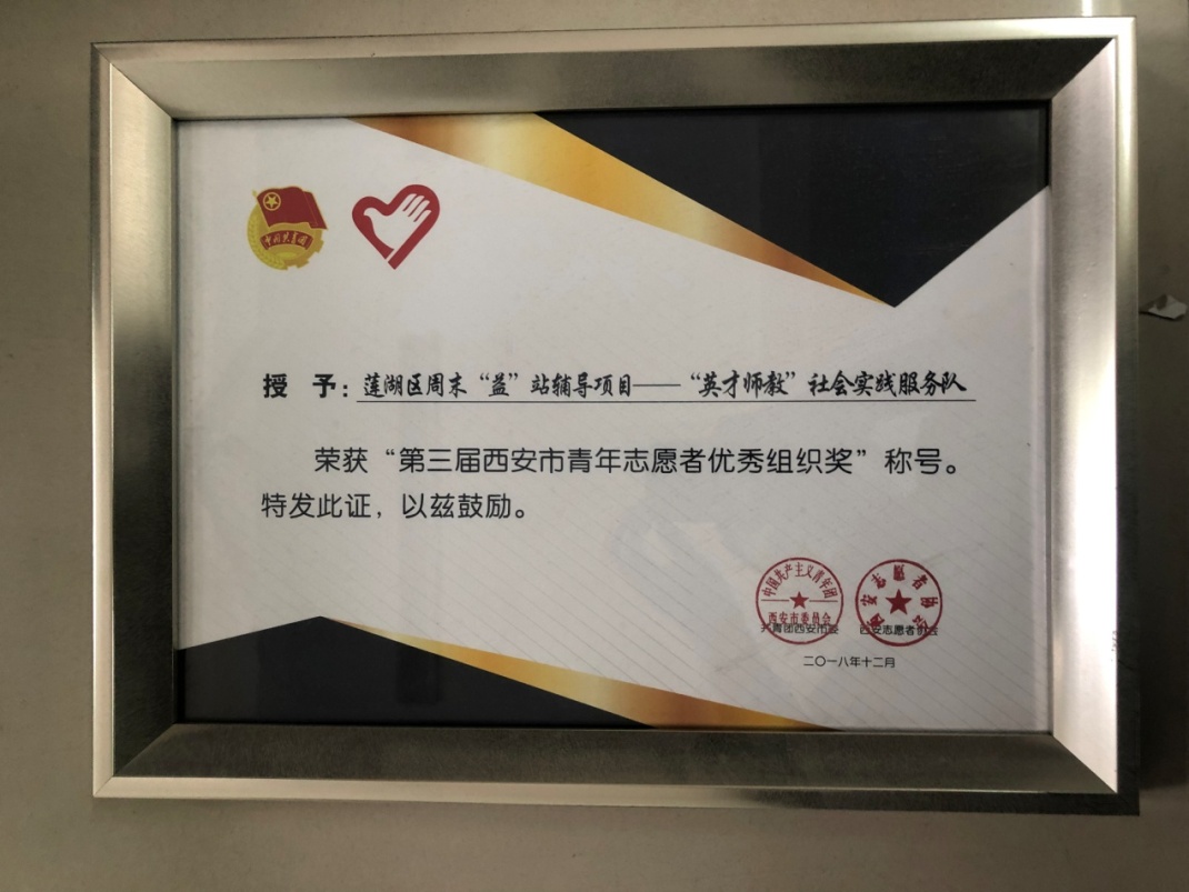 “英才师教”党团员社会实践服务队荣获共青团显示为和西安志愿者协会联合授予的“第三届西安市青年志愿者优秀组织奖”