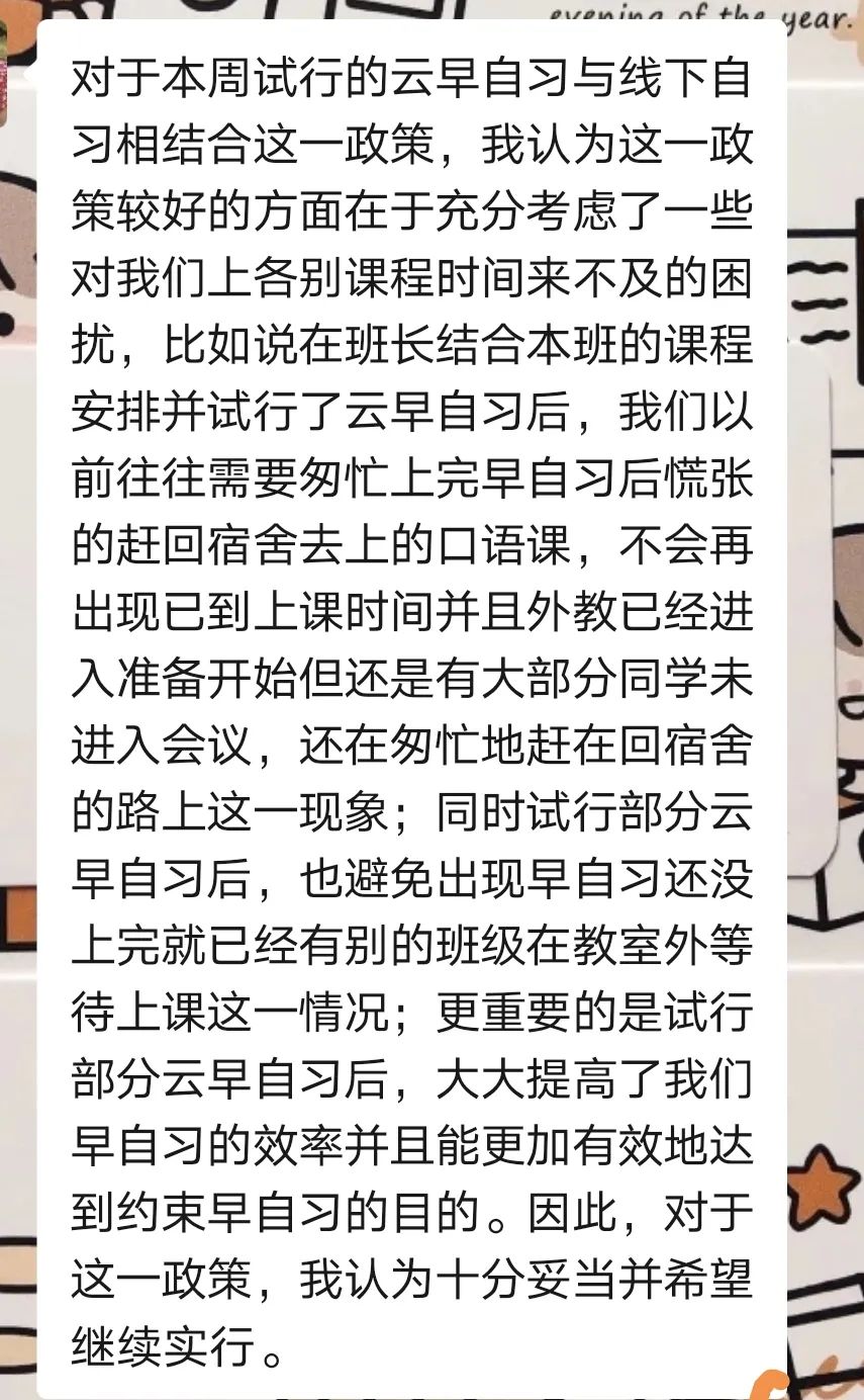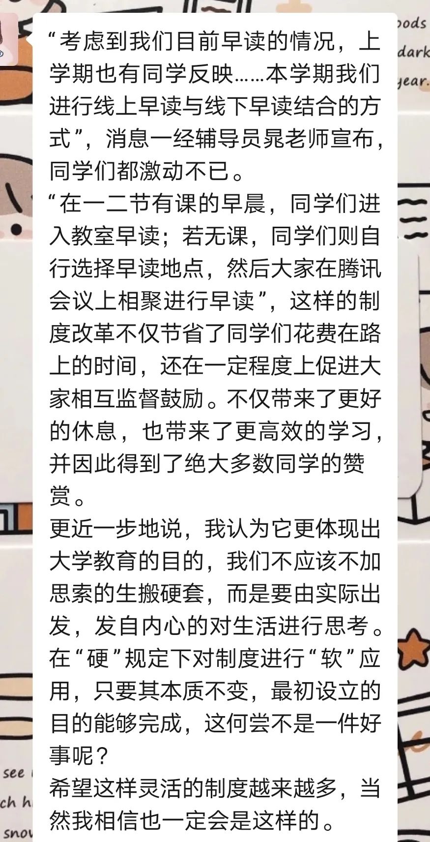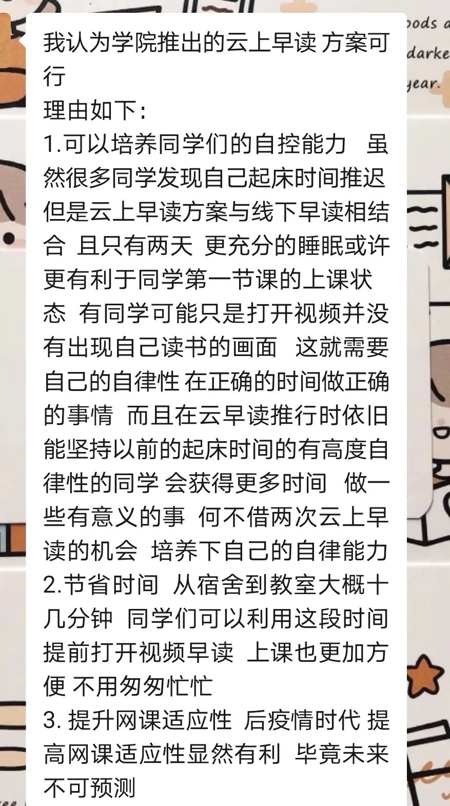 在试行过程中,由于网络问题等原因影响,也有部分同学对新的早自习方案提出了宝贵的意见建议,后期学院会结合实际情况对方案进行改进和探索,找到最适合大众的自习模式。