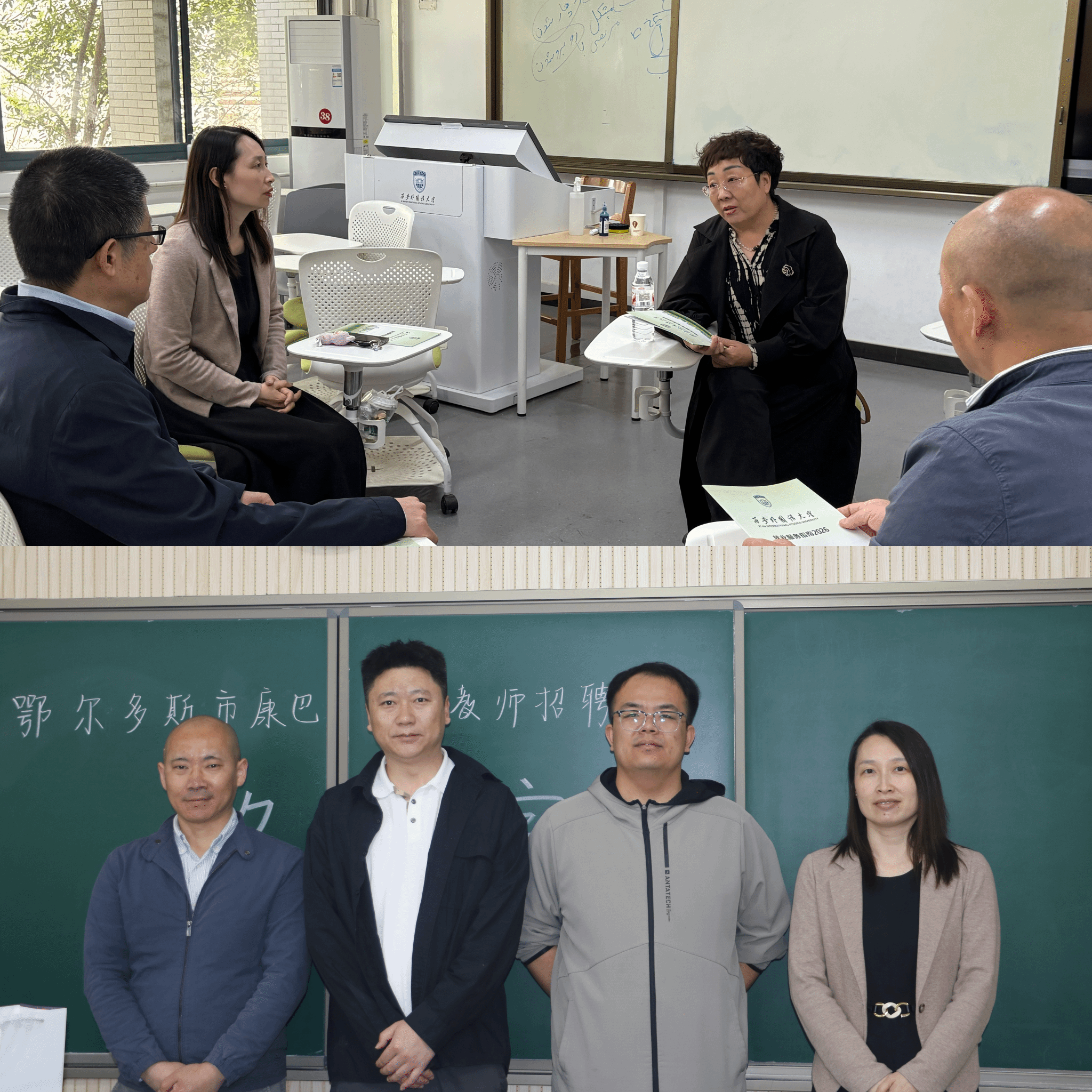 党委书记梅林竹,副院长(主持行政工作)高岩,党委副书记刘一静,毕业班辅导员宋玉珂与康巴什教育局来访人员进行座谈。李美荣介绍了康巴什区教育现状、教师招聘要求等核心内容并高度认可我校往届毕业生素养,杨小江介绍了学校毕业生及近年来就业情况。梅林竹、高岩代表学院对康巴什区教育局来访表示热烈欢迎,并详细介绍了学院历史沿革、办学特色、人才培养等情况,双方就人才供需、新课标新教材背景下康巴什区中小学英语教师素质能力提升培训等深入交流,达成校地深度合作共识。