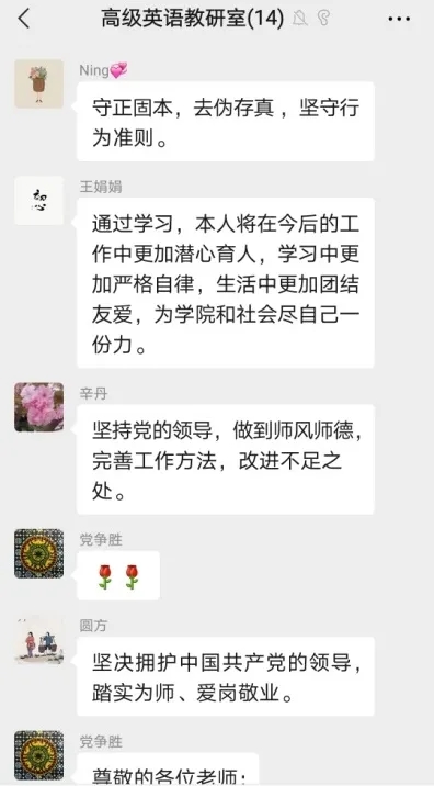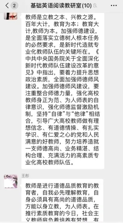 写作翻译教研室、高级英语教研室、基础阅读教研室和教育学教研室等小组采用线上领学和线下自学相结合的方式进行学习,并通过微信群开展了充分地交流研讨。
