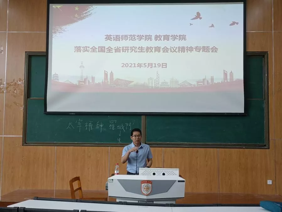 “落实全国全省研究生教育会议精神专题会”在实验楼D107召开。会议由副院长冯东主持,全体研究生导师、研究生辅导员薛璐及全体研究生参加会议。本次会议旨在深入学习贯彻习近平总书记与李克强总理对研究生教育工作的重要指示批示精神,以及全国、陕西省和西外研究生教育会议精神,深刻把握新时期研究生教育的新要求,全面推进英语师范学院研究生教育改革深入发展。