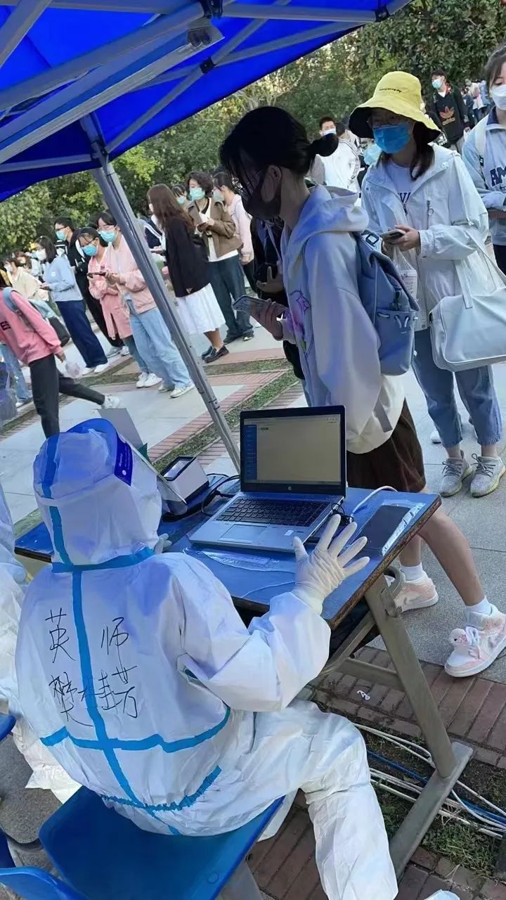 师生志愿者准时到达核酸检测点,领取疫情防护用品,投身核酸检测相关工作。学院党委副书记刘一静以及部分学生志愿者也积极投入核酸采样的试管贴码等幕后协助工作,确保核酸检测顺利进行。