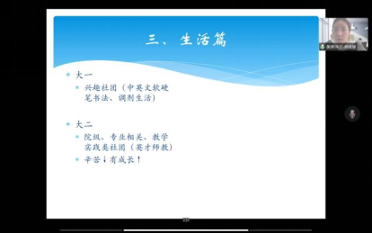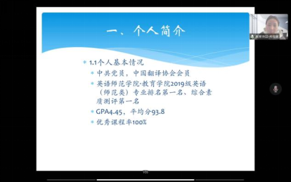 首先何佳妮从个人基本情况、志愿情况及英语基础、语言水平、获奖情况以及夏令营和预推免情况进行了全面的自我介绍。她用自己优秀的履历向大家诠释了“努力到无能为力,才配得上一路颠沛流离”。