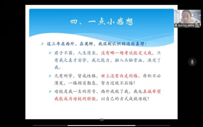10月14日下午13:00 ,西安外国语大学“六位一体”思政进公寓主题教育重点项目:“我和西外”成长故事会——校史文化进公寓实践项目系列活动第一期通过腾讯会议在线上成功举行,本期主讲人由学院2019级英语(师范类)专业何佳妮同学担任。
