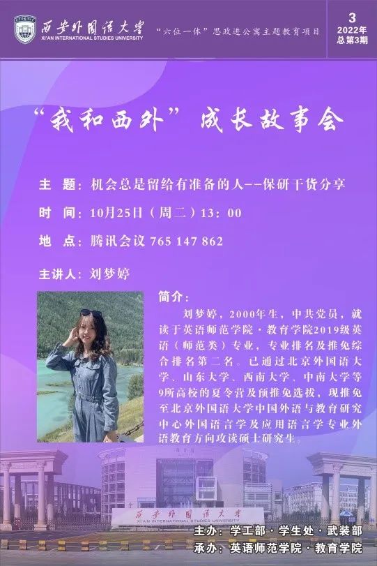 10月25日下午13:00 ,西安外国语大学“六位一体”思政进公寓主题教育重点项目:“我和西外”成长故事会——校史文化进公寓实践项目系列活动(第三期)通过腾讯会议在线上成功举行,本期主讲人由学院2019级英语(师范类)专业刘梦婷同学担任。