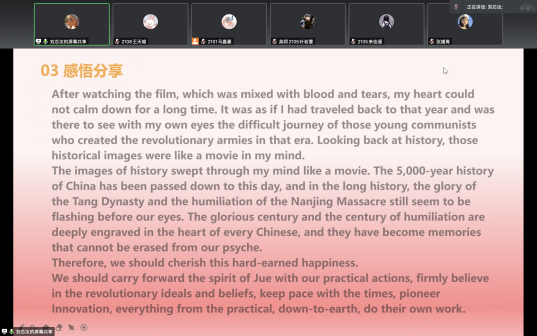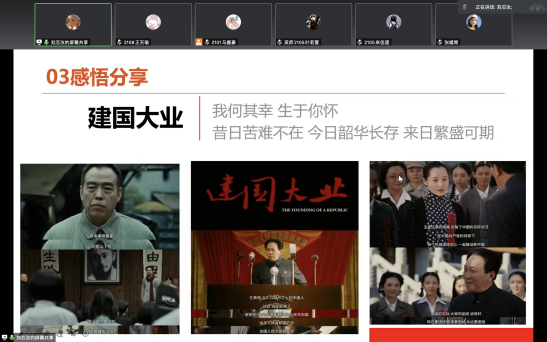 接着,主讲人刘芯汝作观影感悟分享并邀请参会的同学积极分享。刘芯汝同学用流利的英文口语向同学们分享了自己总结的英文版观影感悟,同学们在观看完电影片段后,纷纷利用自己的专业特长进行英文版观影感悟分享。通过这部爱国电影,大家将爱国热情和英语知识相结合,用我们英语(师范类)专业学生的英语知识表达我们心中的爱国情怀。在同学们积极与主讲人互动和分享的过程中,电影分享会的气氛愈加高涨。