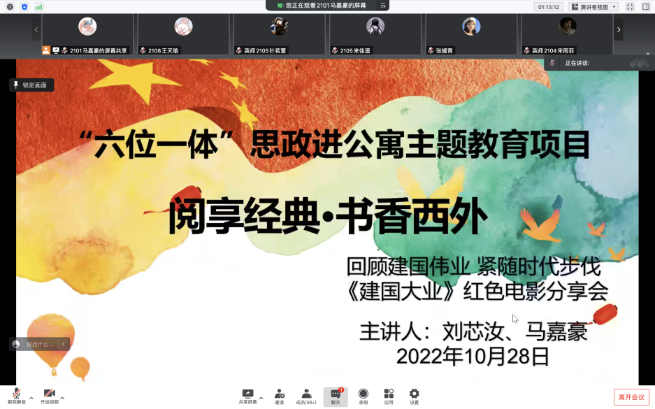 2022年10月28日下午,西安外国语大学“六位一体”思政进公寓主题教育项目:“阅享经典·书香西外”文化育人进公寓活动第一期——“回顾建国伟业,紧随时代步伐”红色电影分享会通过腾讯会议顺利举行。本期主讲人由九州娱乐