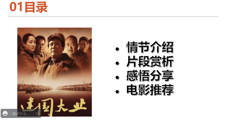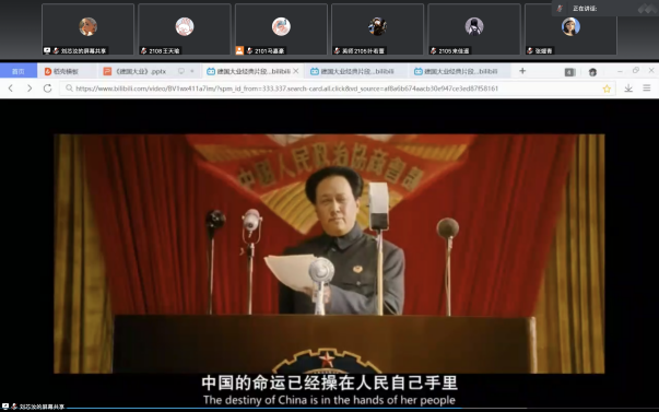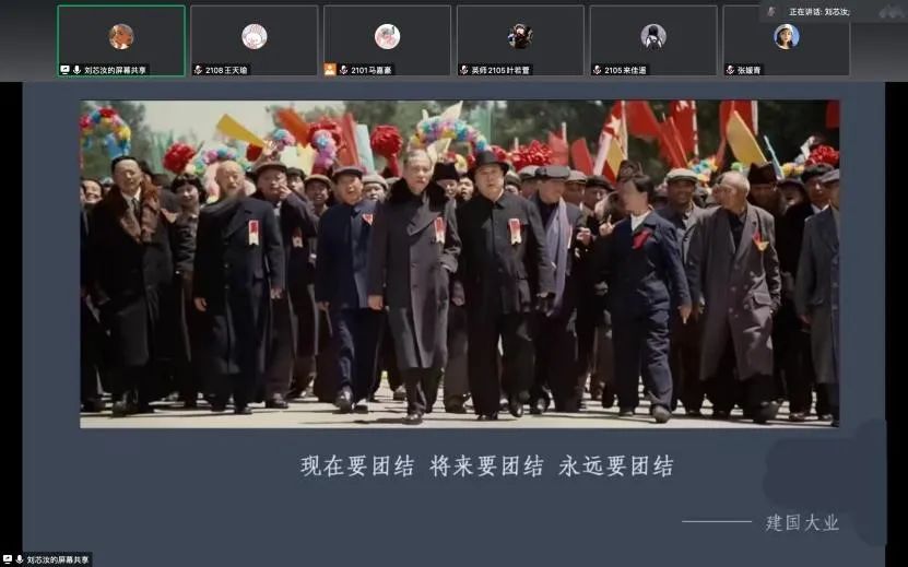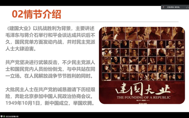 刘芯汝同学首先向大家分享了《建国大业》的情节并观看电影片段。《建国大业》既是一部重大革命历史题材电影,又是一部故事片,以抗战胜利为背景,主要讲述毛泽东与蒋介石举行和平会谈达成共识后不久,国民党单方面发动内战,并对民主党派人士大肆迫害。共产党坚决进行武装反击,不少民主党派人士和国民党内人员纷纷倒戈,与中共站在同一立场。在人民解放战争节节胜利的同时,大批民主人士在共产党的诚恳邀请下历经艰险,奔赴北京参加中国人民政治协商会议。1949年10月1日,新中国成立,举国欢腾。