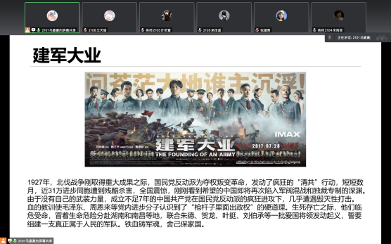 随后,主讲人马嘉豪同学作电影分享推荐。马嘉豪同学首先对一些爱国电影进行分享介绍并观看片段,其中非常推荐同学们观看《辛亥革命》、《建党伟业》、《建军大业》、《长津湖》等爱国主义教育影片,希望同学们通过喜闻乐见的电影形式更加深刻了解中国共产党的发展和壮大,传承红色基因,厚植爱国情怀。