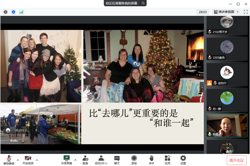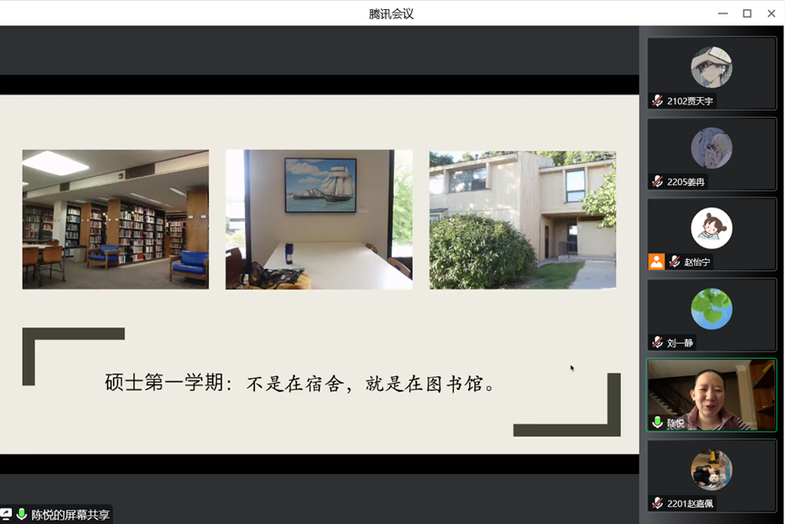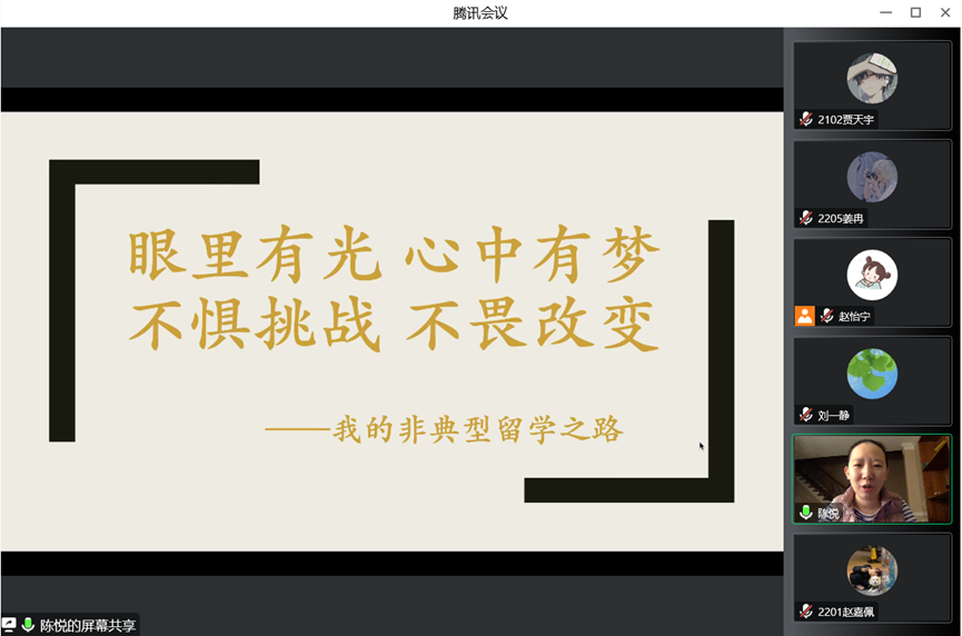 2007级院友陈悦,她在大洋彼岸进行了主题为“眼里有光心中有梦,不惧挑战不畏改变——我的非典型留学之路”的分享。本次分享会由赵怡宁老师主持,学院党委副书记刘一静以及各年级300余名学生参加了活动。