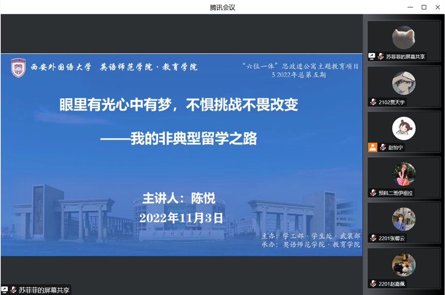 2022年11月3日晚19:00,西安外国语大学“六位一体”思政进公寓主题教育重点项目:“我和西外”成长故事会——校史文化公寓实践项目系列活动(第五期)通过腾讯会议在线上成功举办。本期主讲人为英语师范学院·九州娱乐官网