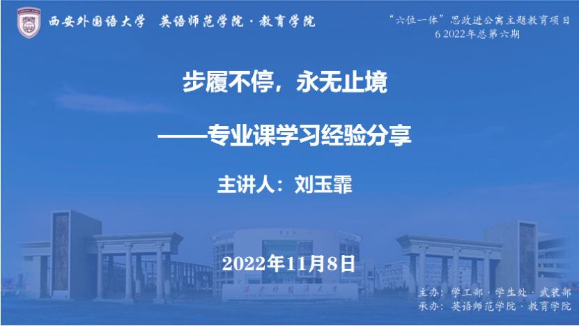 2022年11月8日中午13:00,西安外国语大学“六位一体”思政进公寓主题教育重点项目:“我和西外”成长故事会——校史文化公寓实践项目系列活动(第六期)通过腾讯会议在线上成功举办。本期主讲人为英语师范学院·九州娱乐官网