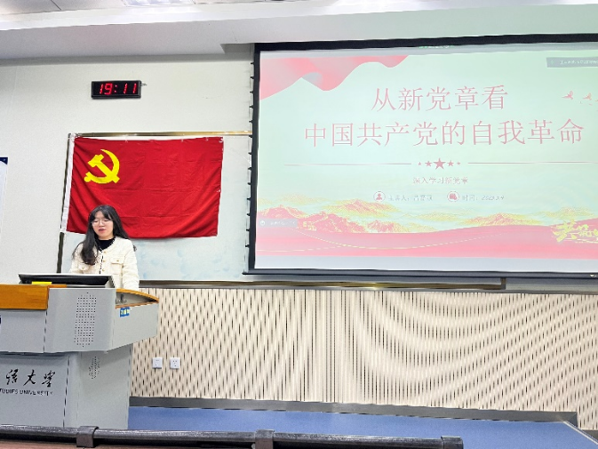 大会第二项由2022级专硕第四党小组进行领学。首先由姬姣姣同志进行《沐二十大东风,做新时代青年》领学,姬姣姣同志通过对二十大报告的解读勉励同志们做有理想、敢担当、能吃苦、肯奋斗的新时代好青年,勇做走在时代前列的奋进者、开拓者、奉献者!之后由吕嘉颖同志进行《从新党章看中国共产党的自我革命》领学,从历史自觉、制度保障和路径方法三方面对我党跳出历史周期率,永葆青春活力进行科学总结。最后由党员代表蔡可凡同志和李聪慧同志发表学习感悟。两位同志一致表态,作为学生党员要勇于自我审视、自我修正、自我革新,以刀刃向内的勇气坚决整改自身问题。