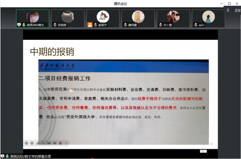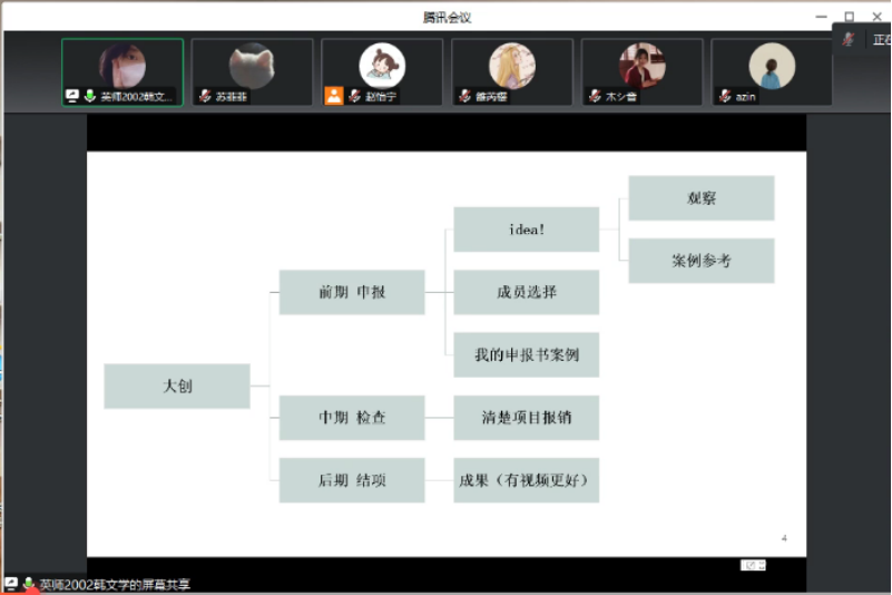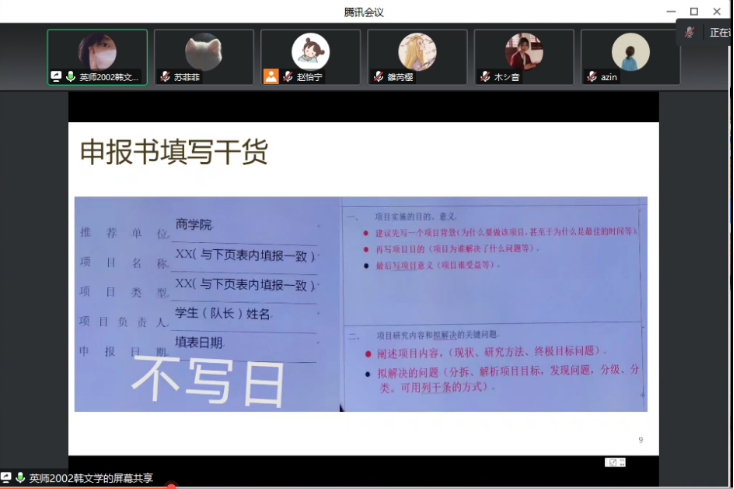 第一部分,大创经验分享,这是本次分享会的重点。韩文学结合自己的经历,按照前期申报、中期检查、后期结项的顺序分享了她在大创比赛过程中的经验。