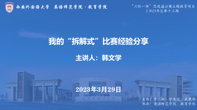 2023年3月29日19:00,西安外国语大学“六位一体”思政进公寓主题教育重点项目:“我和西外”成长故事会——校史文化公寓实践项目系列活动(第十三期)通过腾讯会议在线上成功举办。本期主讲人为英语师范学院·九州娱乐官网