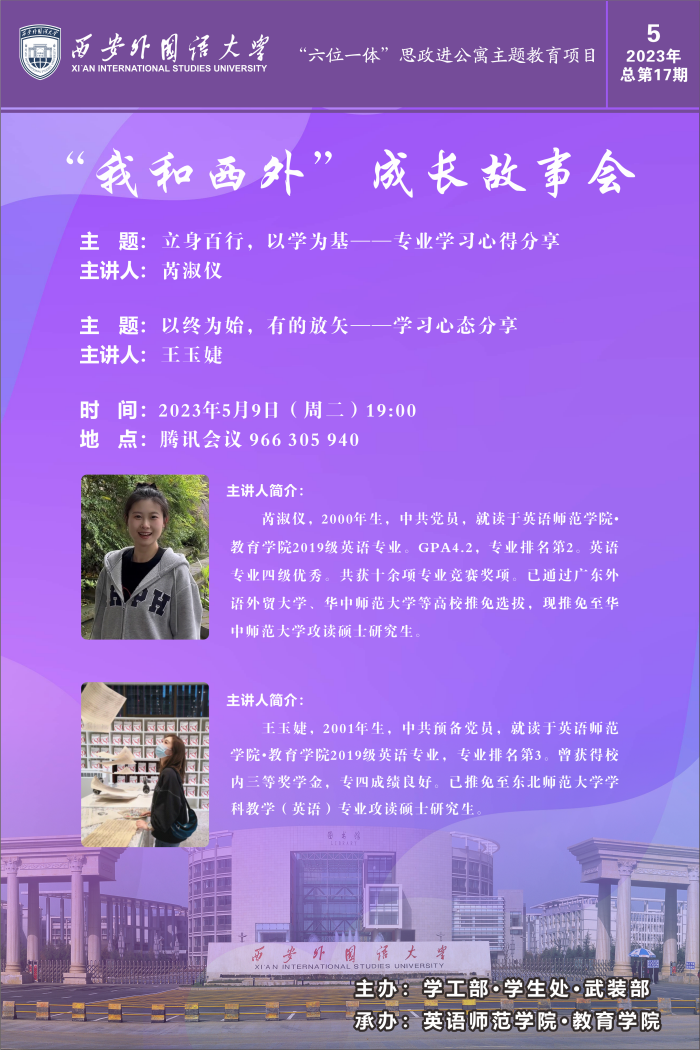 2023年5月9日19:00,西安外国语大学“六位一体”思政进公寓主题教育重点项目:“我和西外”成长故事会——校史文化公寓实践项目系列活动(第十七期)通过腾讯会议在线上成功举办。本期主讲人为英语师范学院·九州娱乐官网