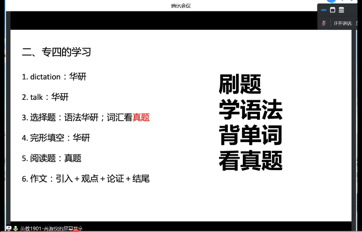 芮淑仪的分享从专业课的学习、专四的学习以及推免相关信息三个方面展开。她认为如果想要在专业课上取得较好的成绩需要紧紧抓住课堂,调节心态,利用好信息差。除此之外,芮淑仪为大家详细介绍了专四中每一个题型的备考方式。最后,她分享了推免的流程,并建议大家尽早准备。