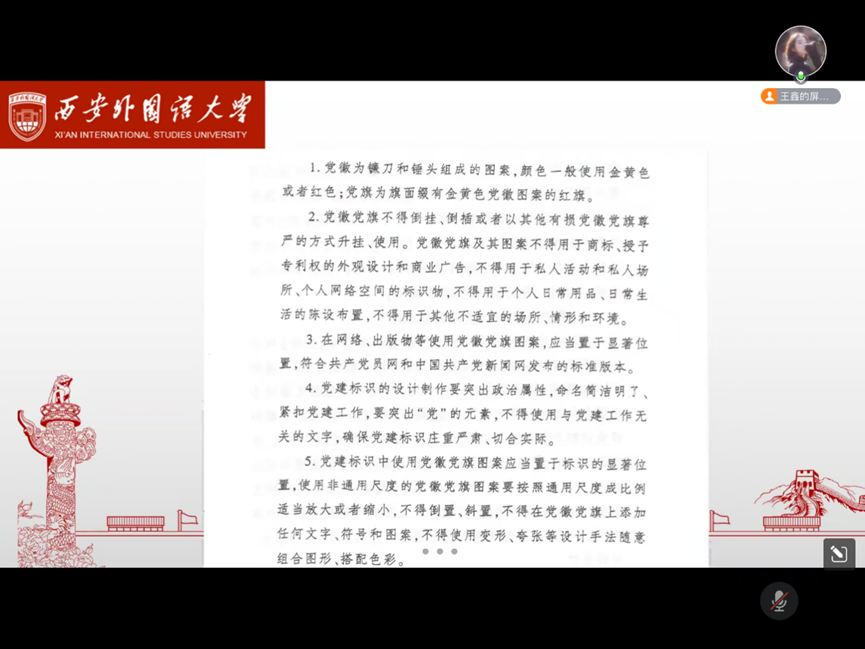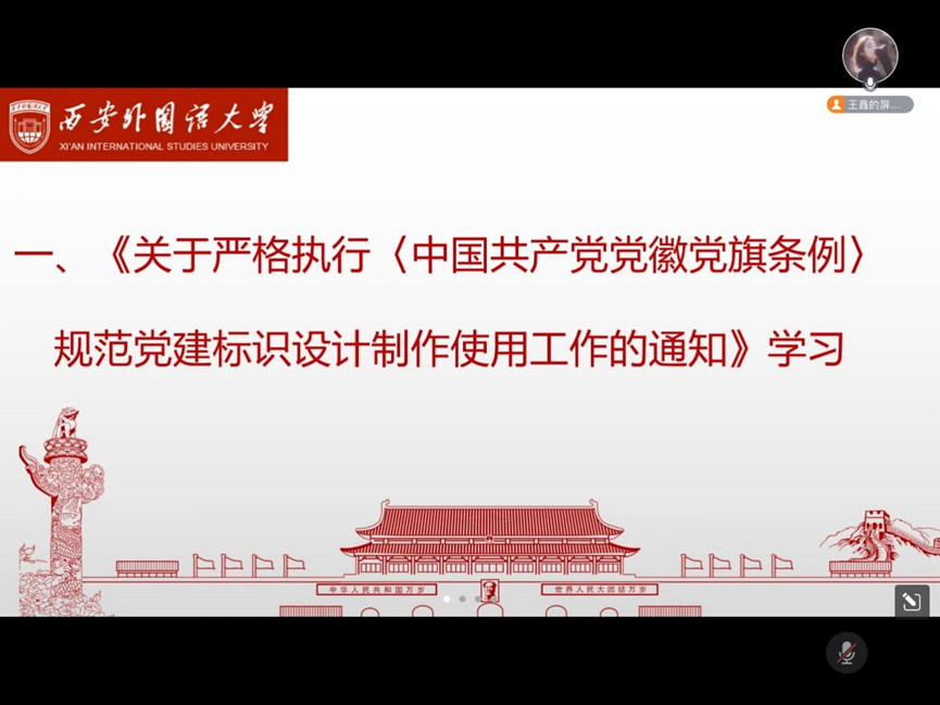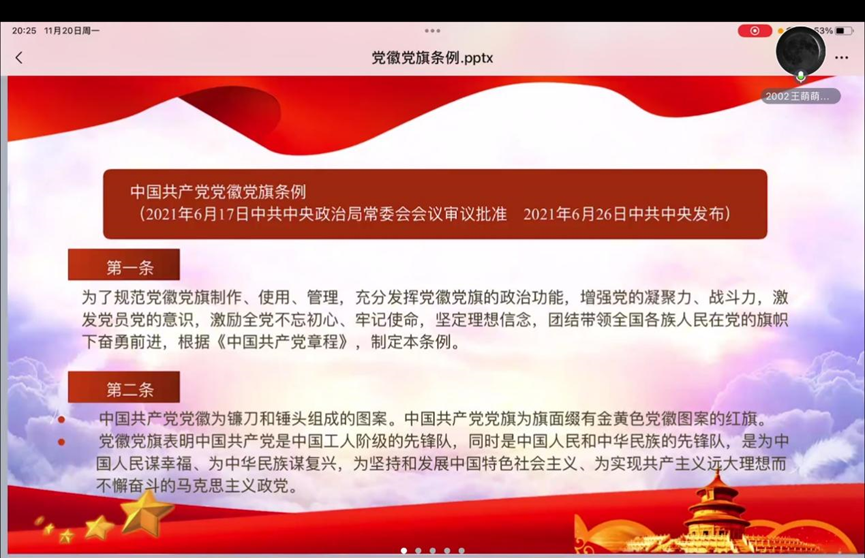 学生第二党支部线上举行《中国共产党党徽党旗条例》专题学习会,会议由支部书记王鑫主持,王萌萌同志领学,全体党员参会。