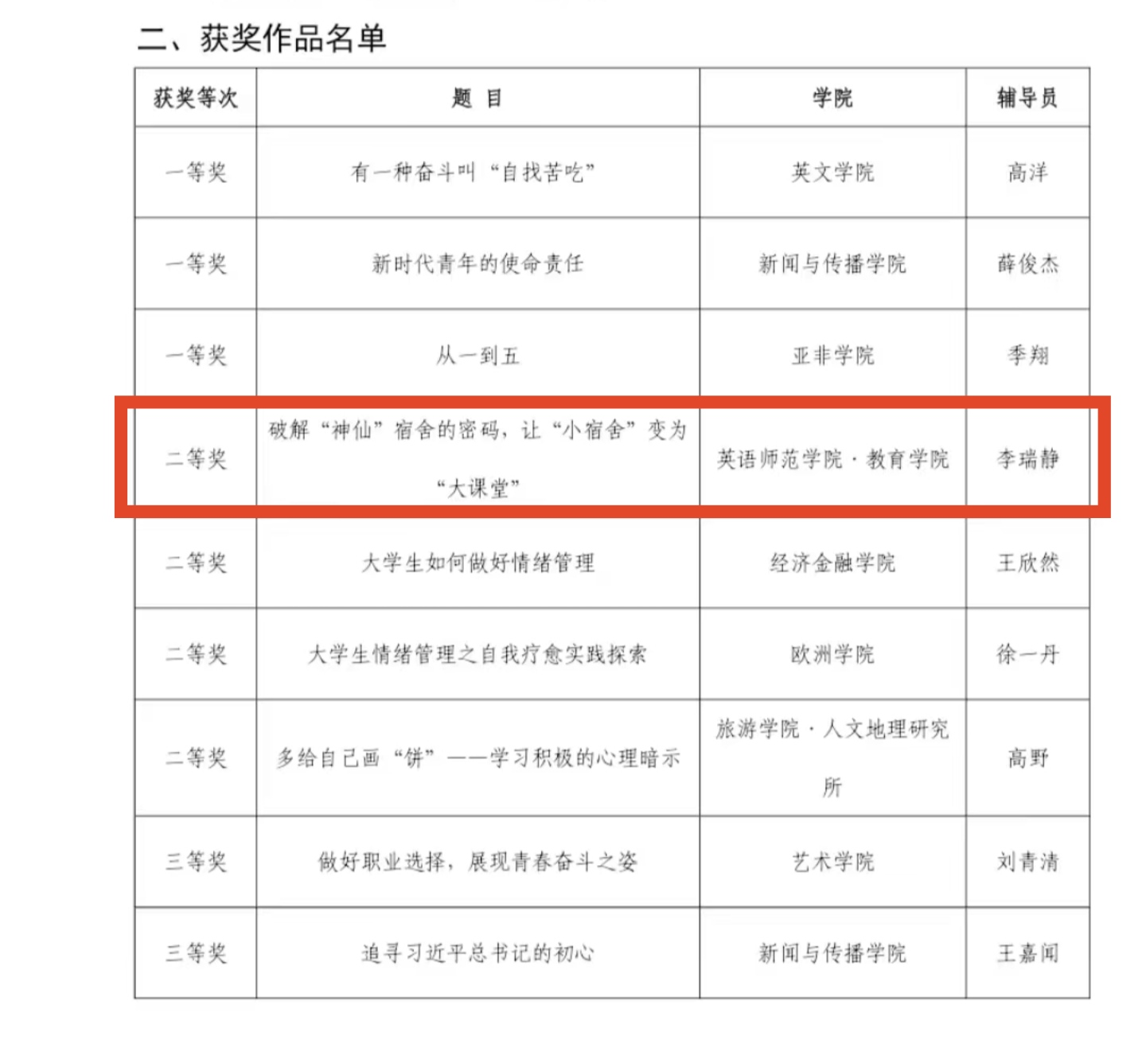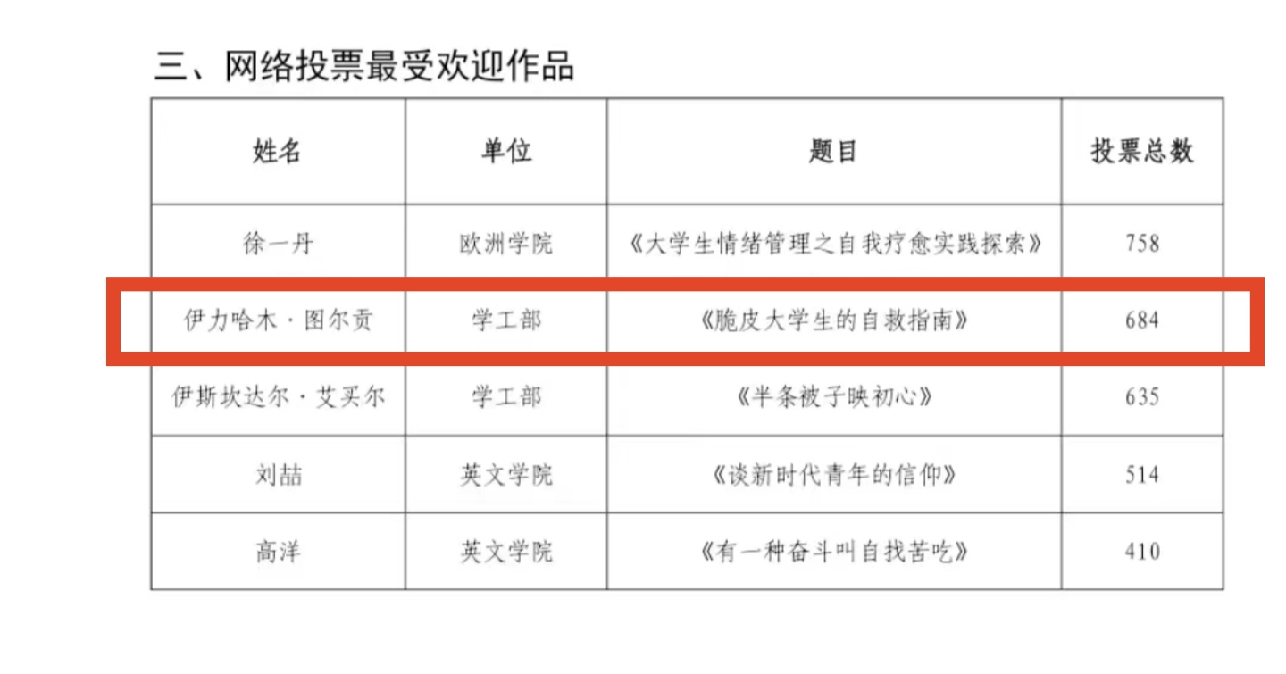 2022级辅导员李瑞静老师的作品《破解“神仙”宿舍的密码,让“小宿舍”变为“大课堂”》荣获二等奖,预科生辅导员伊力哈木·图尔贡老师的作品《脆皮大学生的自救指南》荣获网络投票最受欢迎作品。