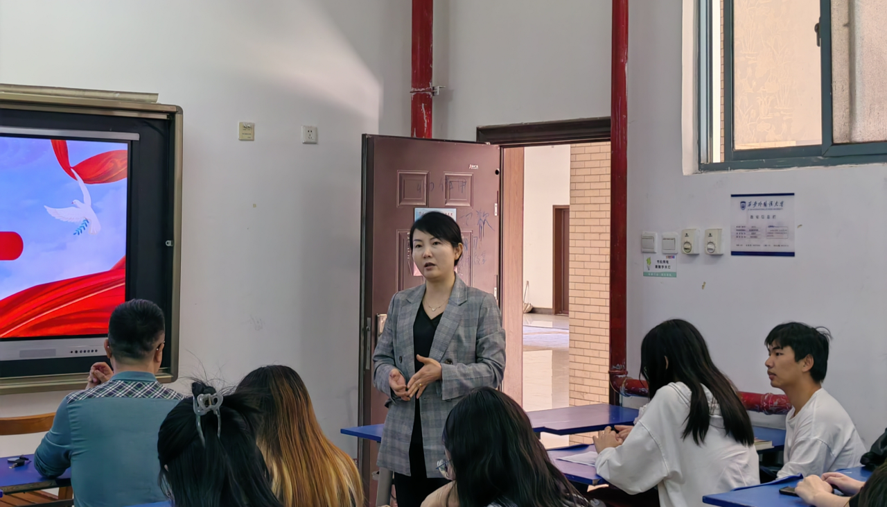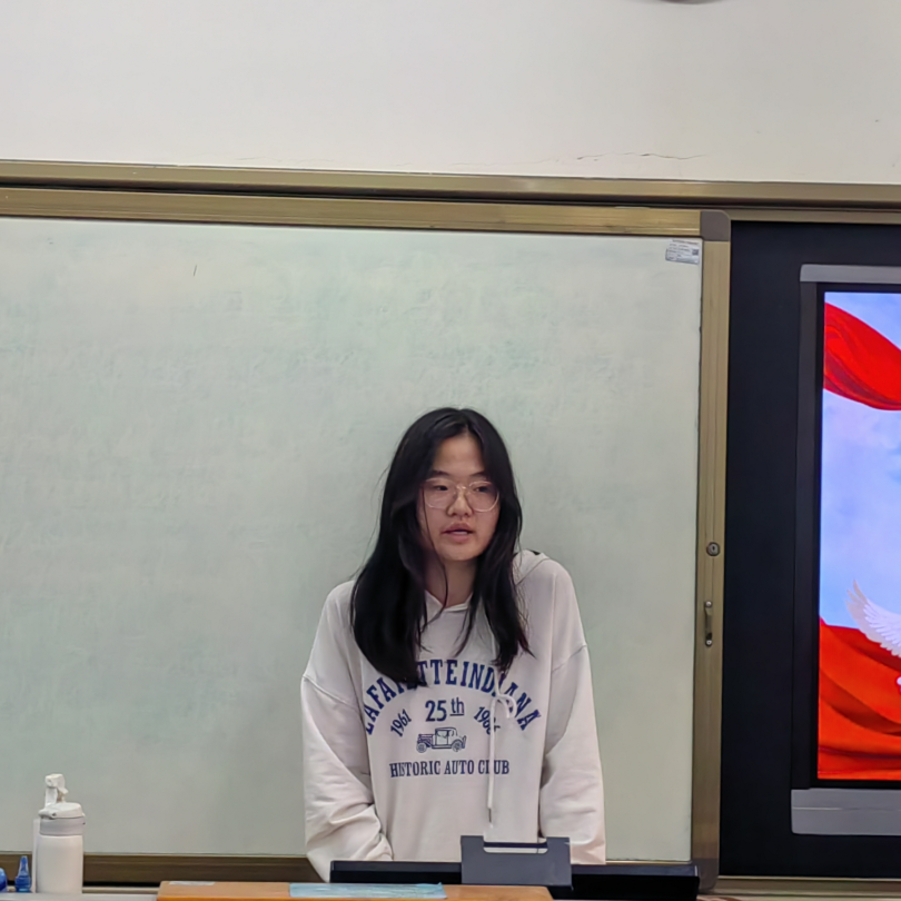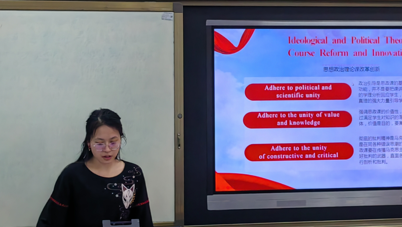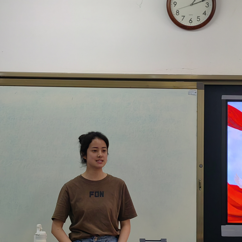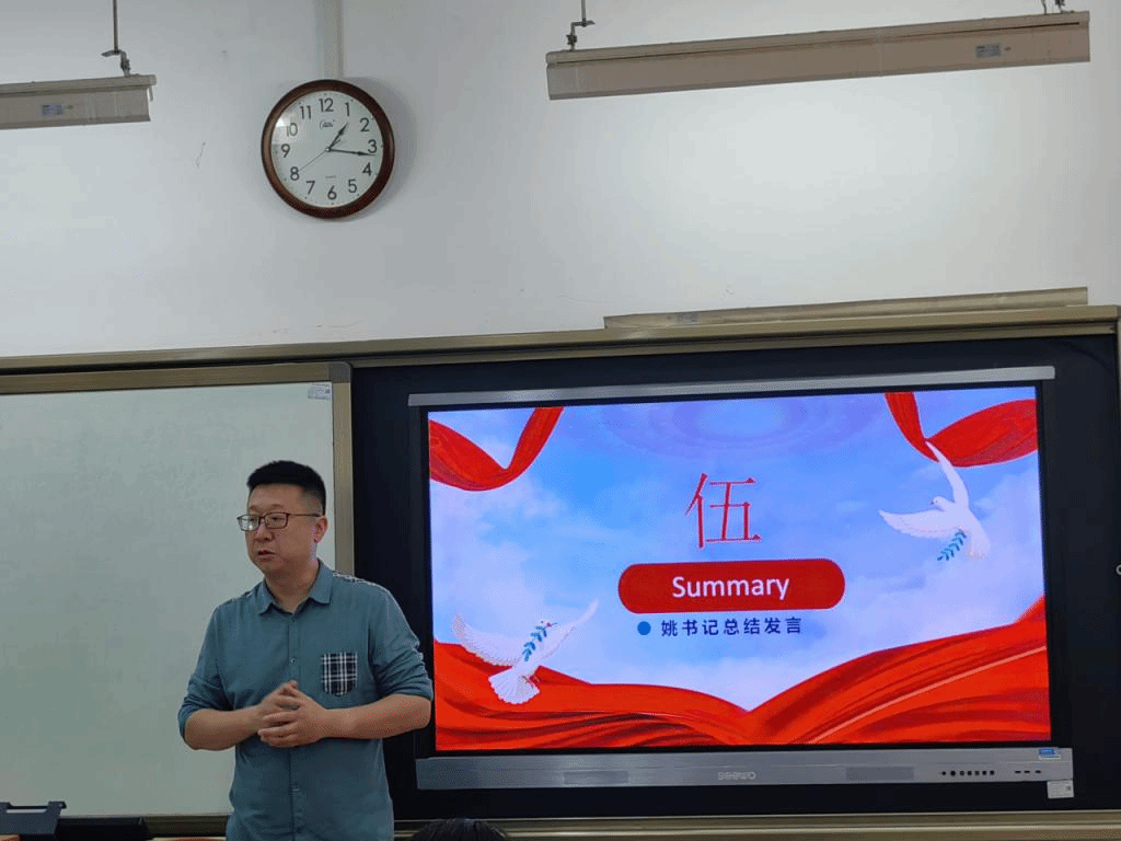 活动第二项,周孝清同学以中英双语的形式带领全体成员学习习近平总书记对思政建设作出的重要指示。高校思政课教师要积极传播马克思主义科学理论,弘扬社会主义核心价值观,引导学生坚定理想信念。