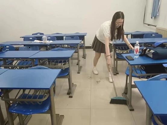 活动结束后,同学们自发地开展教室打扫活动,践行劳动精神,增强自身的责任担当意识。