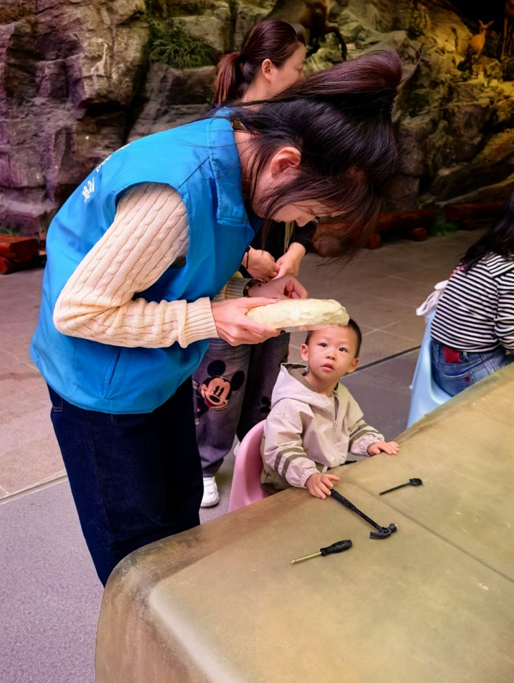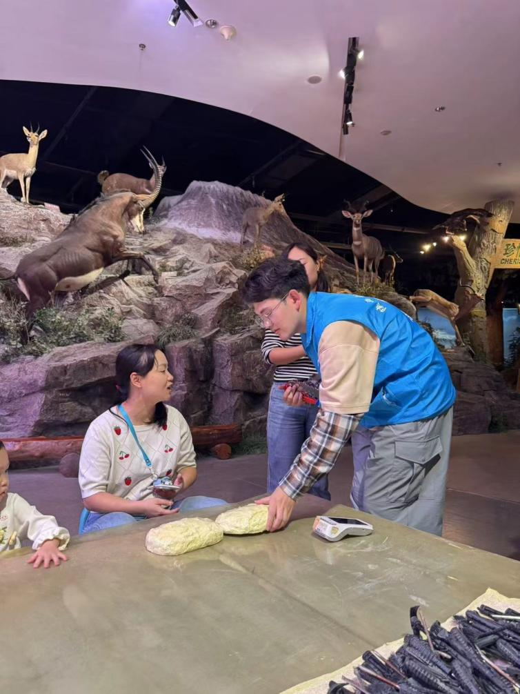 经过中午短暂的休整后,志愿者们活力满满地回到了各自的岗位。他们为游客拍合照,用镜头记录此刻的美好。他们和游客亲切互动,和儿童游客一起体验开采化石模型的快乐。时间悄然流逝,到了闭馆时间,志愿者们才恋恋不舍地离开岗位,和自然展馆说再见。